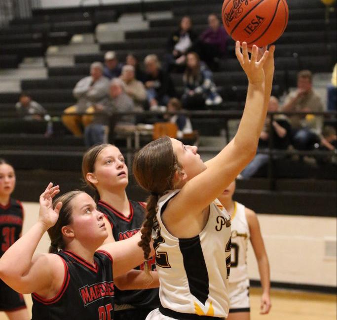 TOP LEFT: Putnam County Junior High celebrated its eighth grade night Tuesday with a 51-16 win over Marseilles. Eighth grade team members honored were Dayzlyn Cioni (from left), Anahi Avila, Avery Lenkaitis, Makenna Goulding, Kinsey Pierski, Murphy Hopkins, Jaylynn Dickey, Lillian Bouxsein and Anni Judd. ABOVE: PC’s Anni Judd takes in a layup in Tuesday’s Putnam County eighth grade night. LEFT: PC’s Avery Lenkaitis shoots for two in Tuesday’s Putnam County eighth grade night.