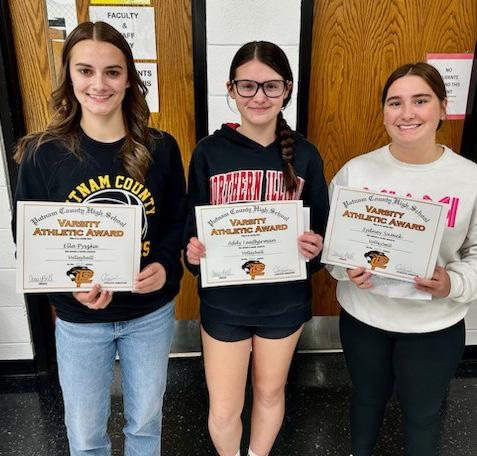 TOP LEFT: Seniors honored at the Putnam County volleyball night were Ella Pyszka (left), Addy Letherman and Sydney Samek. TOP RIGHT: Putnam County volleyball varsity members were honored at the awards night on