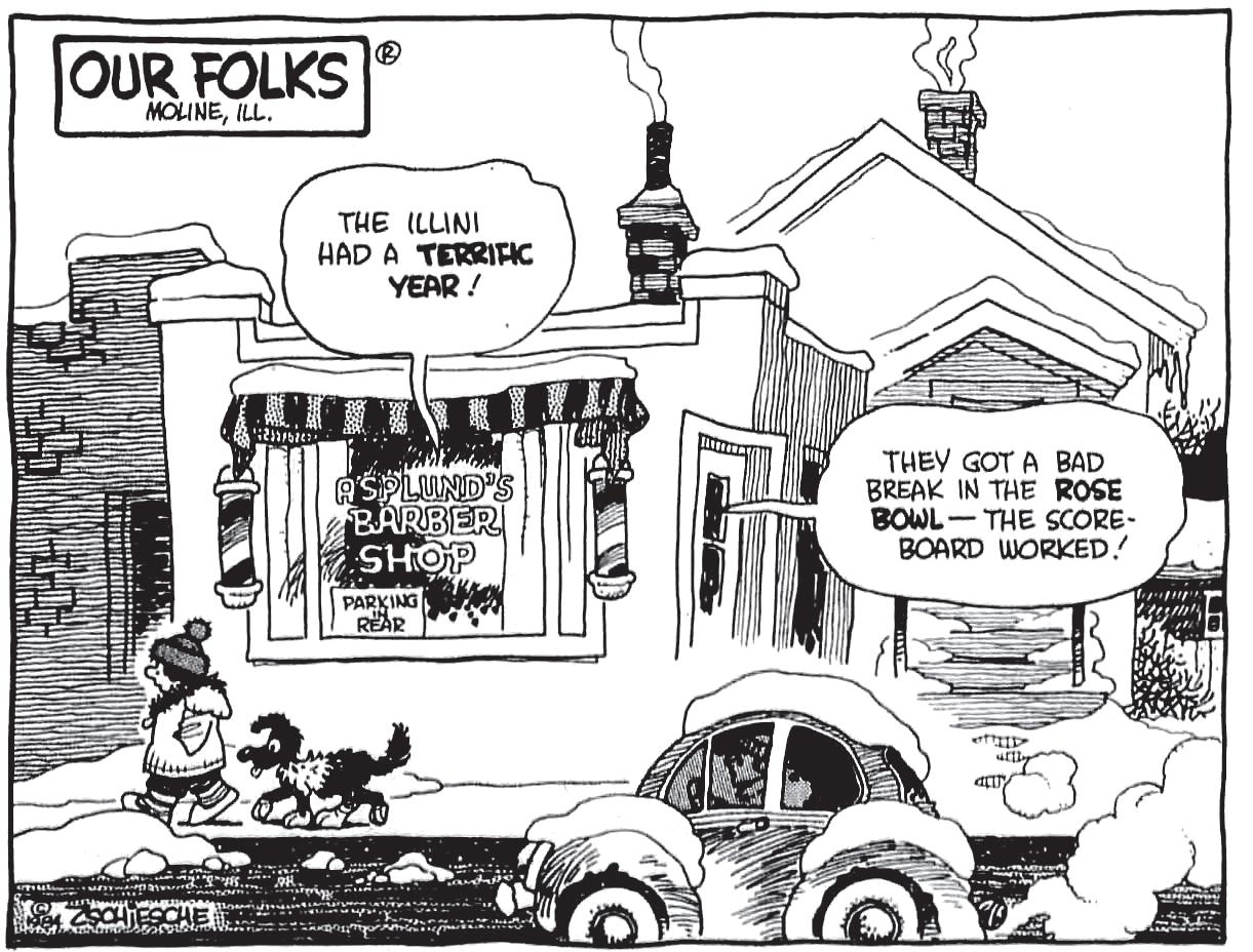 One of Prophetstown’s notable artists, Bob Zschiesche (1929-96) was a cartoonist who was hired in 1950 as an assistant on Frank King’s long-running “Gasoline Alley” comic strip. Before his work appeared in the national strip, his first cartoon works were printed in the Prophetstown Echo. Zschiesche later became editorial cartoonist for the Greensboro, North Carolina, Daily News newspaper. After a brief stint back assisting with “Gasoline Alley,” he moved on to syndicating his own editorial cartoon series, “Our Folks,” in 1980, depicting everyday scenes in a community close to home. He also worked on the “Barney Google & Snuffy Smith” and “Harley Hogg” strips at various points.