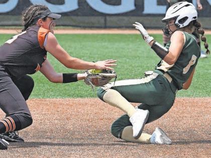 St. Bede’s Emma Slingsby slides back into third base as Biggsvillle’s Shelby Bowman in the Class 3A Sectional championship game on Friday, May 26, 2023 at St. Bede Academy.