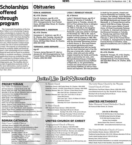 The Community Foundation of the Fox River Valley’s 2013 Scholarship Program offers scholarships to students who will attend an accredited institution of higher education on a full-time basis during the 2013-14 academic year. Eligibility is limited to residents of the foundation’s service area, which includes southern Kane County, the city of Aurora and Kendall County. The majority of scholarships are based on academic ability and financial need. A few scholarships do not consider financial need and are based on academic ability or academic excellence. Scholarship application forms are available through Feb. 4 and may be obtained online at www. communityfoundationfrv.org/scholarshipprogram.asp. The deadline date for receipt of application materials is Feb. 4. For more information, send an email to sch@communityfoundationfrv.org or call 630-896-7800.