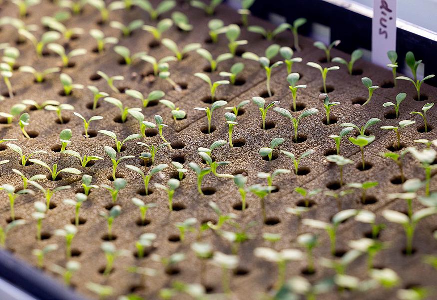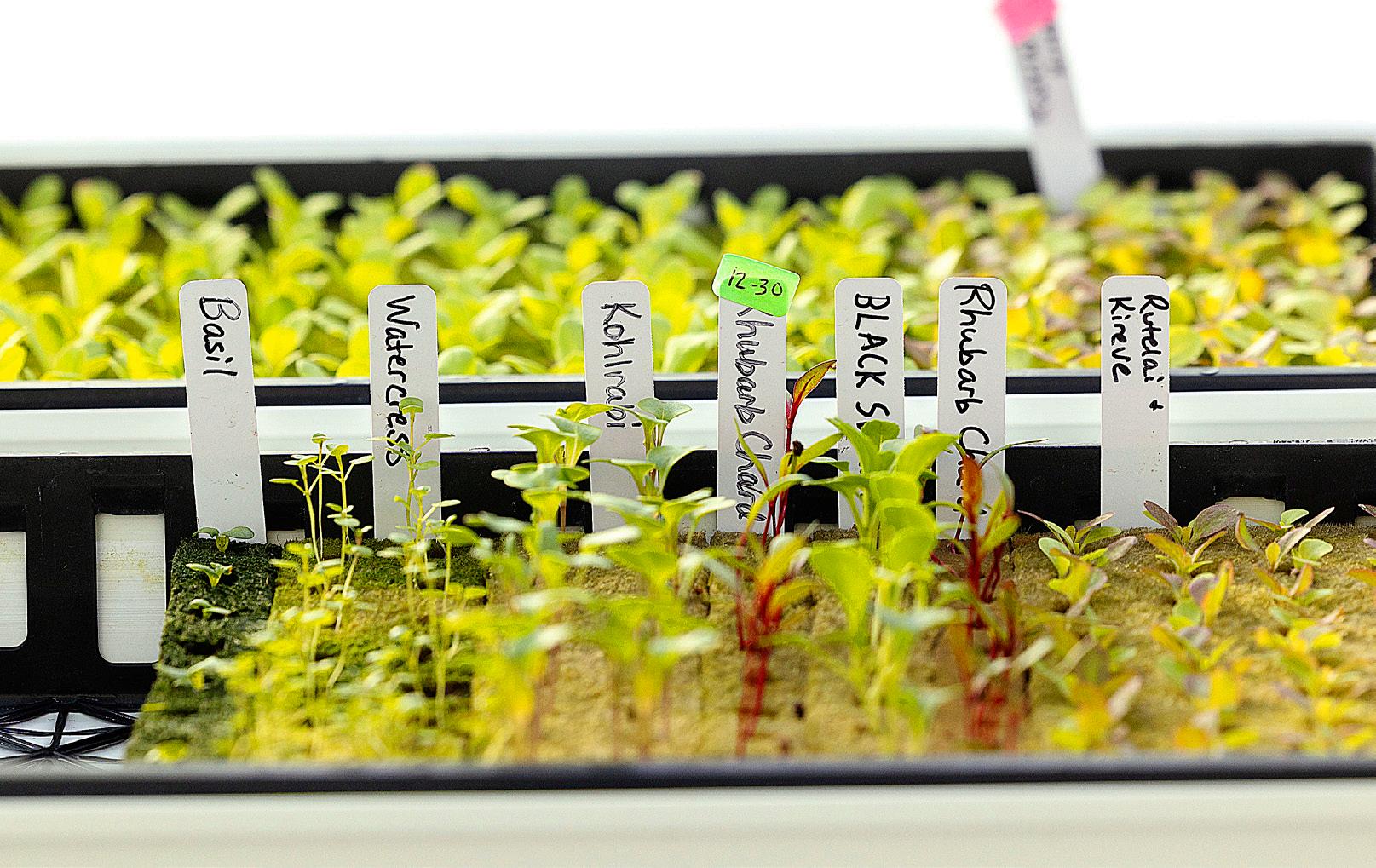 The process begins on a table in a room attached to the greenhouse; seeds are planted in moistened rock wool in large trays placed under a clear domes and controlled lighting, where they germinate and begin to grow. A heating pad under the trays helps create humidity.