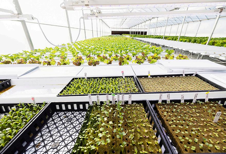 The climate-controlled greenhouse measures 44 feet wide by 128 feet long and can hold up to nearly 10,000 different plants. The entire system comes from Cropking of Lodi, Ohio.
