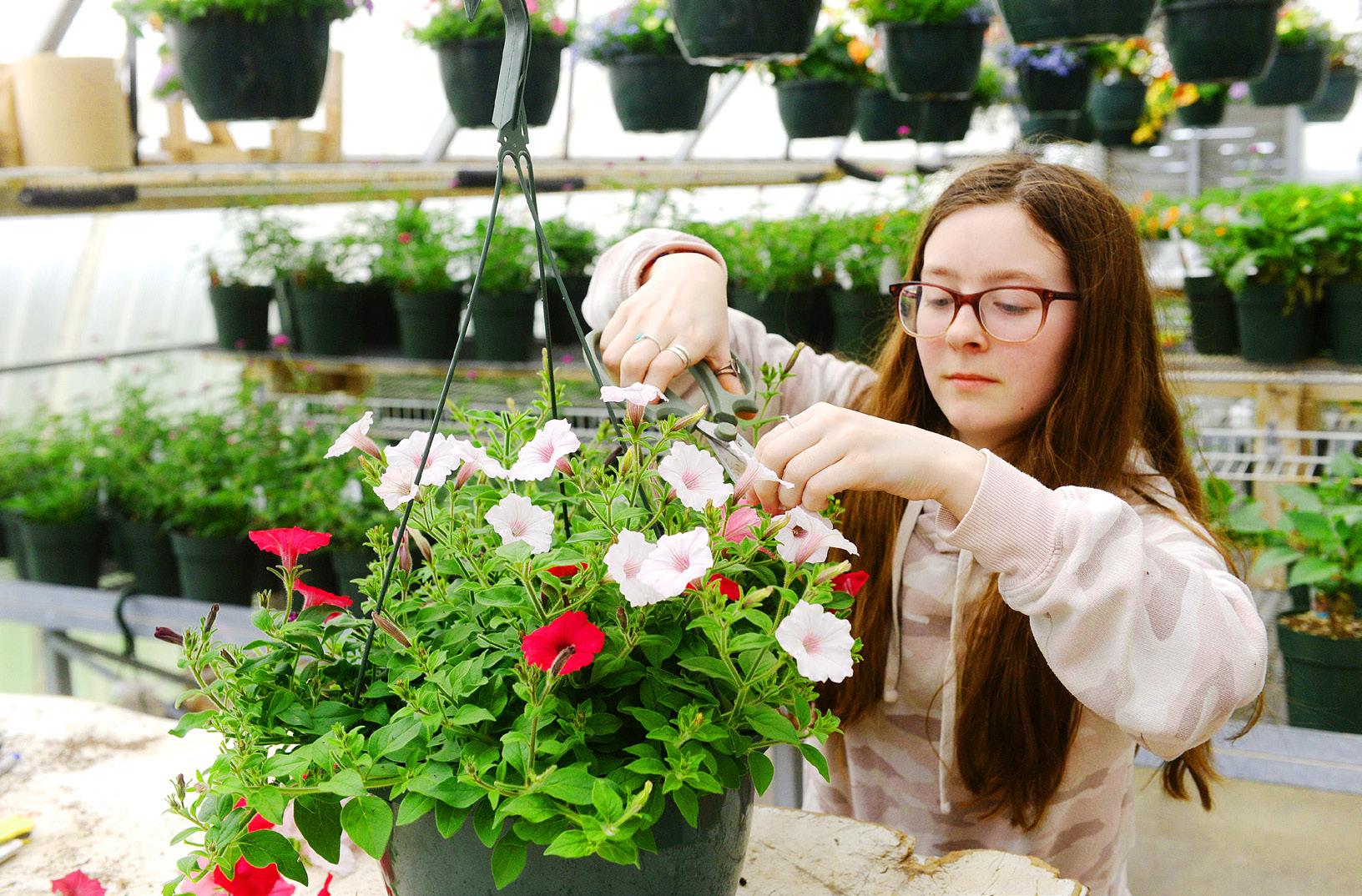 Erica Tryggestad trims one of the hanging flower baskets for sale at the Forreston High School FFA Greenhouse last year. The greenhouse will be open on select days starting April 25 with plants for sale and operated by students in Kelley Parks’ horticulture classes.