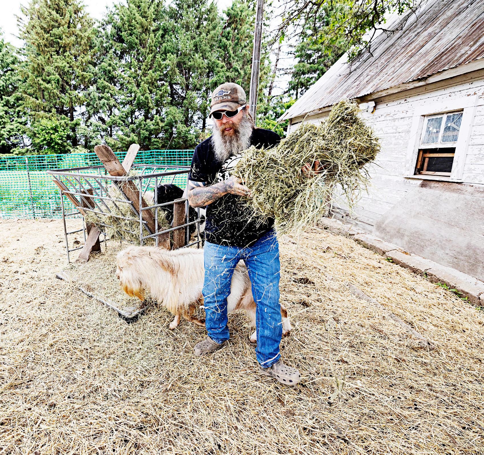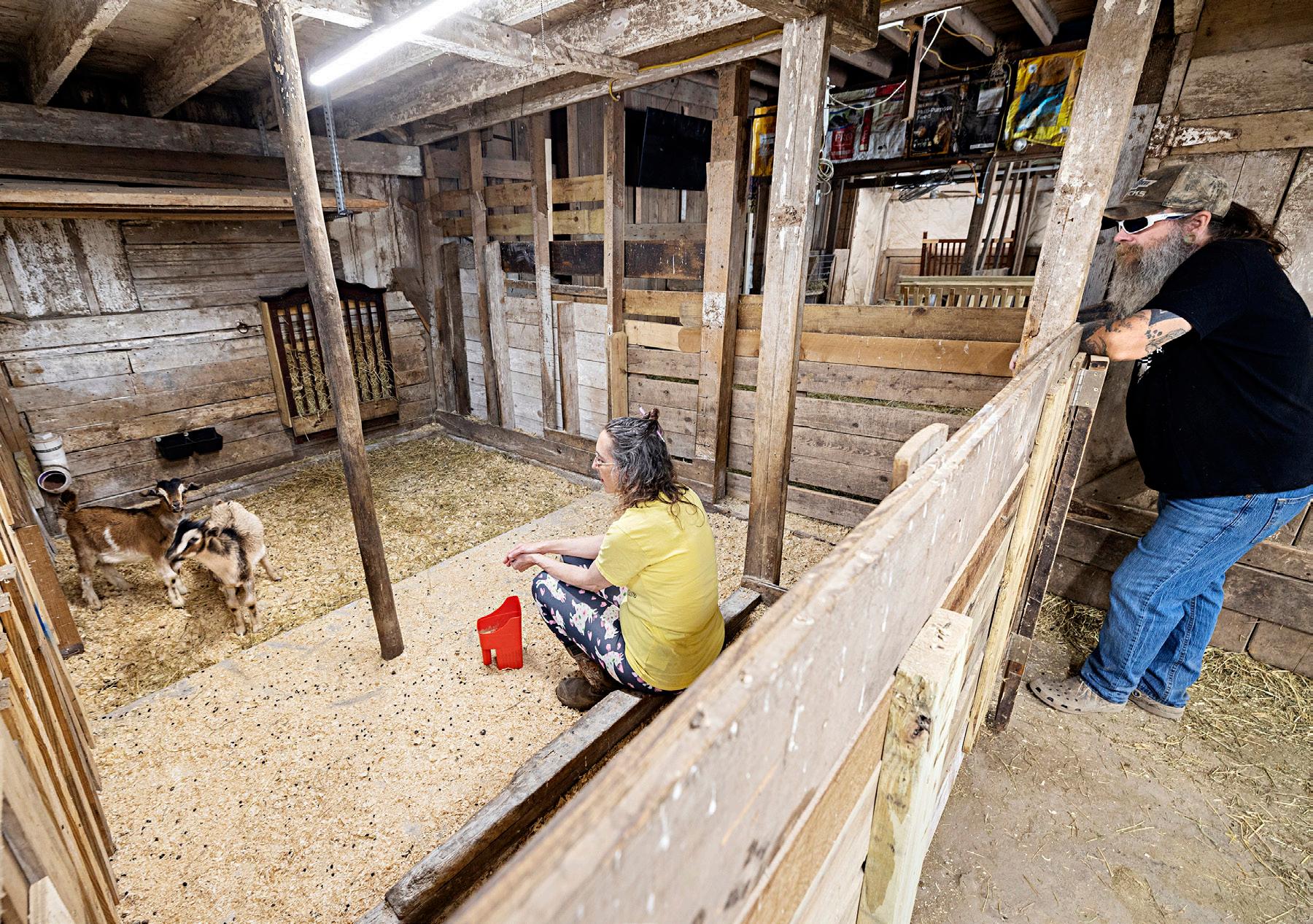 Abby and Shawn tend to some of their Arapawa goats. The couple hopes to be able to breed and donate the goats to zoos. “[We want] to be able to make a difference in a critically endangered breed,” Abby said.
