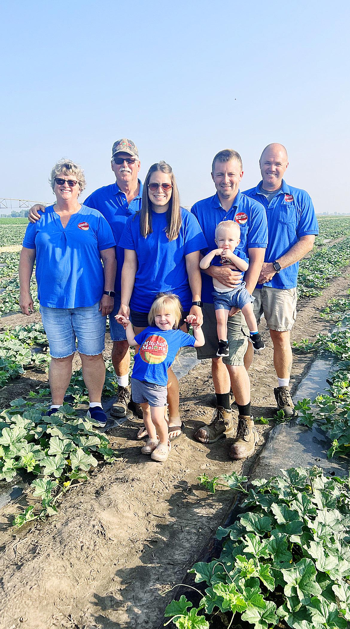 Mitchell Melons has been growing melons east of Tampico for nearly 60 years. Its management team includes (from left) owners Jeanne and Doug Mitchell; Whitney Mitchell-DeWitte, holding her daughter, Laiken; Brandon DeWitte, holding son Logan; and longtime employee Mike Kelly.