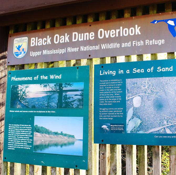Illinois’ longest natural sand dune is located on the grounds of the Lost Mound National Wildlife Refuge, located on the former Savanna Army Depot, 8 miles north of town. The depot was used for manufacturing and storage of military weapons until it closed in 2000. The area has largely been left in its pre-closure state, with nature taking over in certain spots. The Black Oak Dune Overlook at the depot-turned-refuge provides a view of the river and its sand banks, as well as the mouth of the Maquoketa River. Before the depot was built, ornate box turtles were commonplace in the area; a repopulation effort has been underway for nearly a decade. According to the Stewards of the Upper Mississippi River Refuge website (stewardsumrr.org), the prairie provides a significant habitat for grasslands birds whose populations have been in decline, including the upland sandpiper, western meadowlark, loggerhead shrike, grasshopper, henslow and lark sparrow.