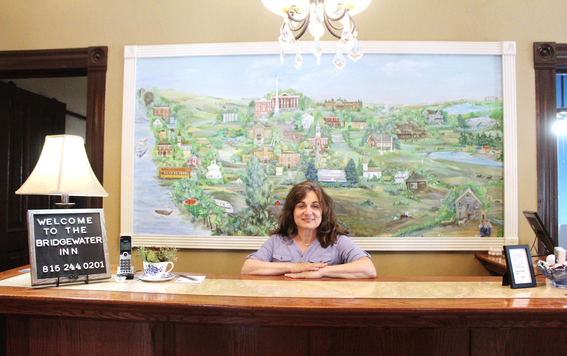 Maria Krull stands in front of a piece of artwork that’s become a favorite of both guests and local visitors: a painting of sights throughout Carroll County, by local artist Armella Kneale, who was also an instructor at the former Shimer College in town. “People come in, especially people who have lived here and are staying here, and they’re like, ‘I can’t believe you guys have this.’ They’re excited to see all of the different places.”