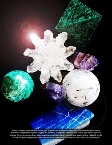 Nature’s Treasures owner Sandy Staas says each type of crystal in her shop can provide a different healing effect. Green malachite is said to absorb negative energies and pollutants, as do purple ametrines; blue-colored lapis lazulis is supposed to boost the immune system, lower blood pressure and heal inflammation; tourmalinated quartz (white crystals with streaks of black) helps give energy during travel; and the familiar spike-shaped crystal quartz is also said to help heal many ills.