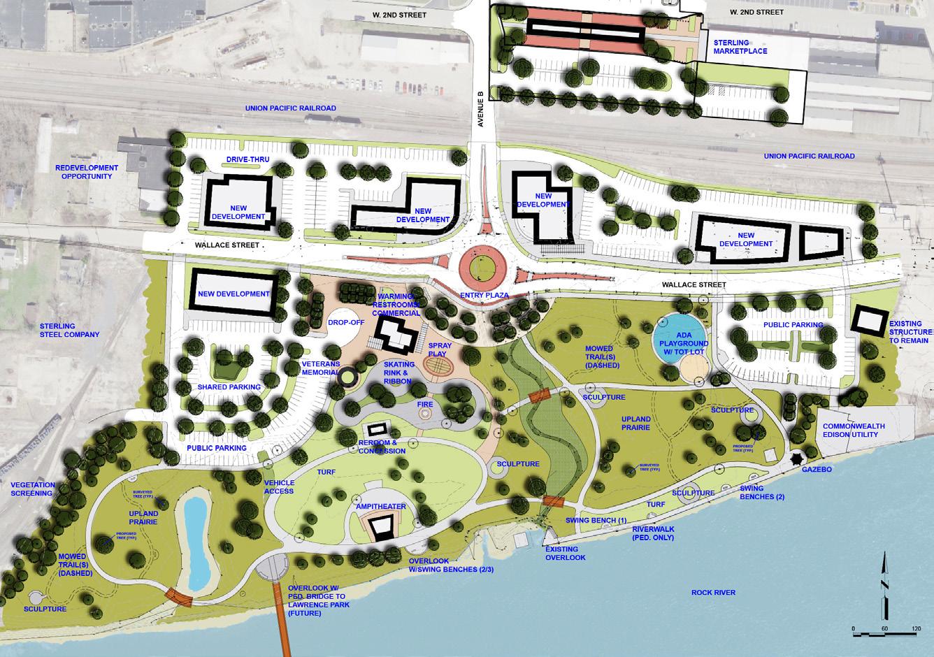 The master plan for Sterling’s Riverfront Reimagined project. Among the proposed features: an amphitheater, trails and paths, playground, skating rink, water feature, and river overlook areas. Go toriverfrontreimagined.com for more information.