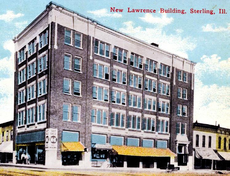 The “New Lawrence Building” in downtown Sterling is seen here, circa 1910. On the corner of the building is a sign advertising a suit sale at M&K, and on the ground floor facing First Avenue is a restaurant.
