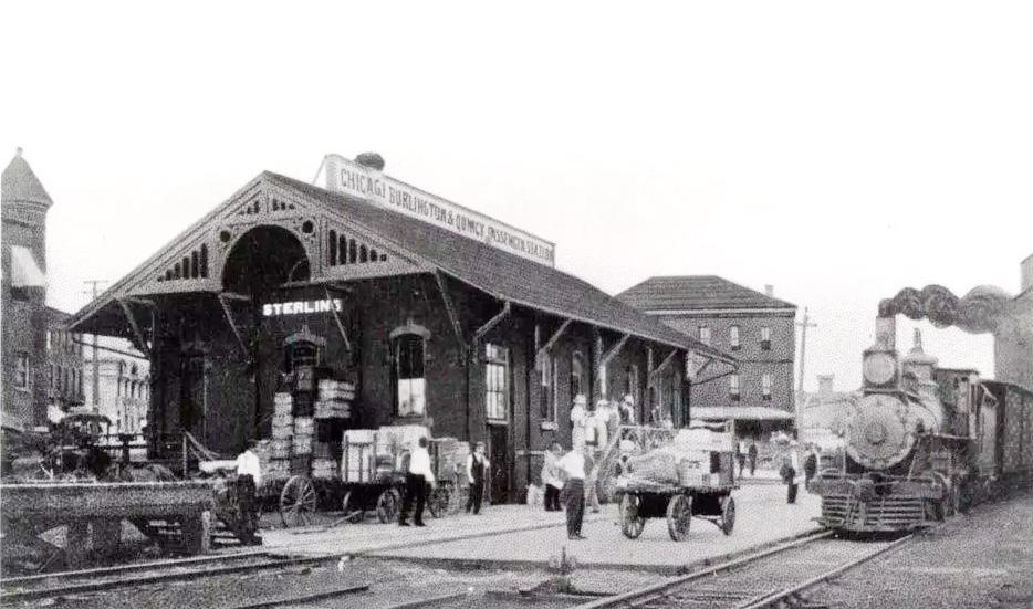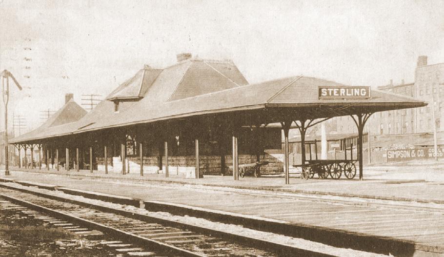 Left: The CN&W Depot in downtown Sterling, circa 1909. In the background is the Simpson and Co. Coal & Wood. Below: A train pulls into the CB&Q passenger station in downtown Sterling.