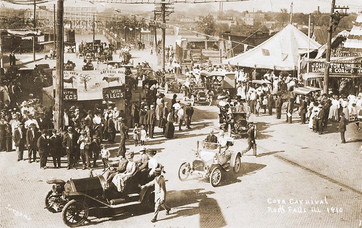 Downtown Rock Falls was bustling with activity during the 1910 Corn Carnival, a once annual event in the city. The Johnston Lumber and Coal store is at right, and the First Avenue Bridge can be seen in the background. At left, a carnival attraction advertises a “natural born” threelegged calf and colt.