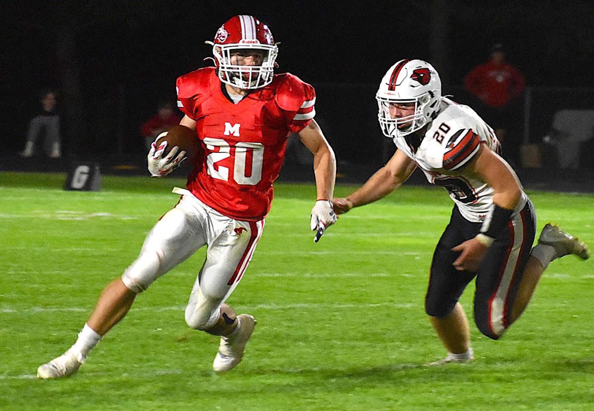 Morrison’s Brady Anderson (20) carries the ball as Forreston’s Dane Setterstrom pursues him last season at Morrison High School.