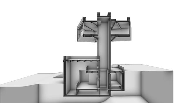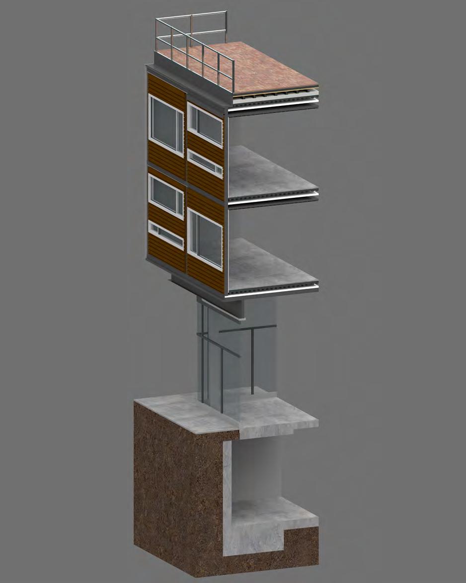 72 SECTION A NORTHEAST ELEVATION 1'-0" 10'-0" 10'-0" 15'-0" 13'-8" PAVER WATER-PROOFING MEMBRANE WOOD PANELING SPACER FLASHING INSULATION CONCRETE SLAB ON METAL DECK RAINSCREEN INSULATION GYPSUM BOARD FIBER CEMENT INSULATING GLASS CONCRETE SLAB ON METAL DECK CEILING GYPSUM BOARD CEILING MULLION CONNECTING JOINT INSULATED GLASS PANEL CONCRETE SLAB CONCRETE CONCRETE FOUNDATION BASEMENT SLAB FIRST FLOOR SLAB SECOND FLOOR SLAB THIRD FLOOR SLAB ROOF TOP POD HOTEL | A STRUCTURAL INVESTIGATION BROOKLYN, NY | FALL 2022 CRITIC: MARCUS CARTER FIBER CEMENT GLASS WINDOW PAVER STEEL MULLIONS RESTURANT HOTEL HOTEL HOTEL - BROOKLYN, NY SECTION, ELEVATION PUTMAN Parking lot WATER-PROOFING MEMBRANE WOOD PANELING SPACER INSULATION CONCRETE SLAB ON METAL DECKING GYPSUM BOARD CEILING STEEL GIRDER STEEL MULLIONS GLASS WINDOW STEEL FRAMING CONCRETE FOUNDATION CONCRETE CONCRETE SLAB SIDEWALK PAVER GROUND 01 04