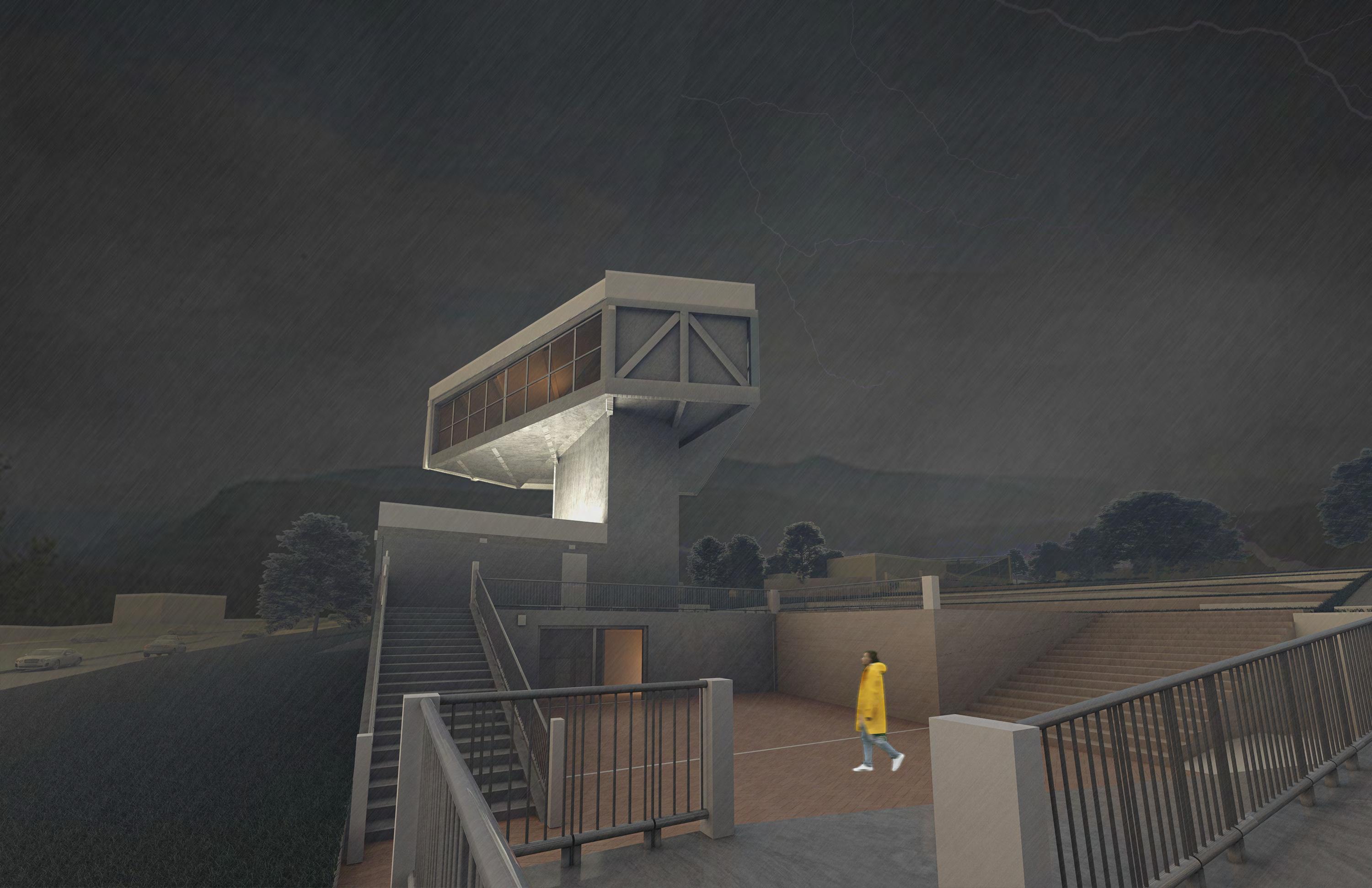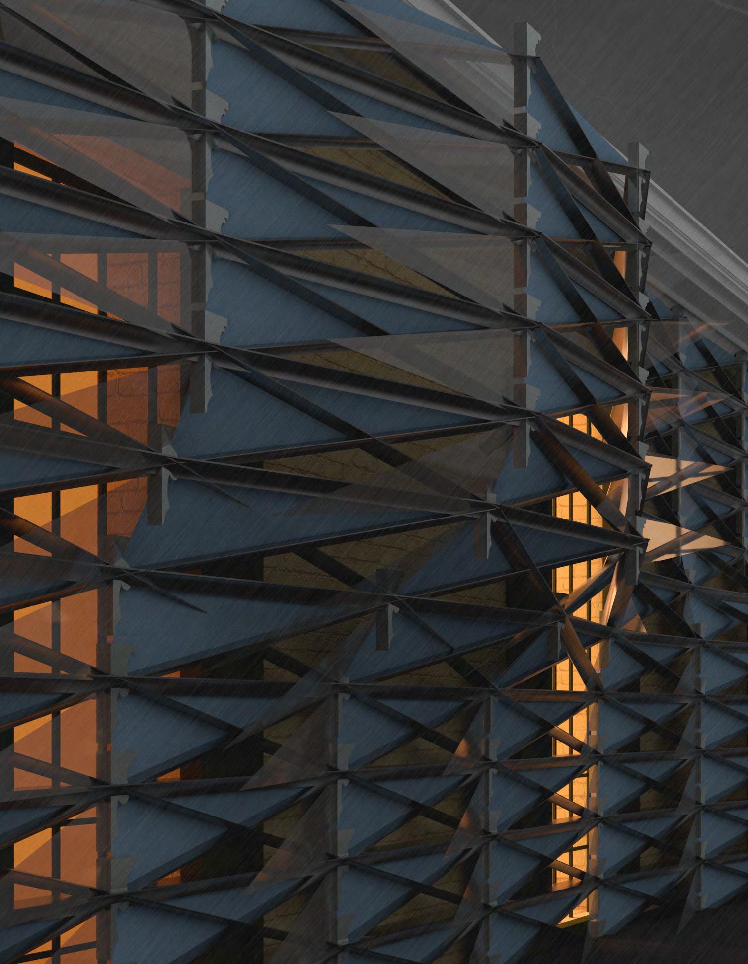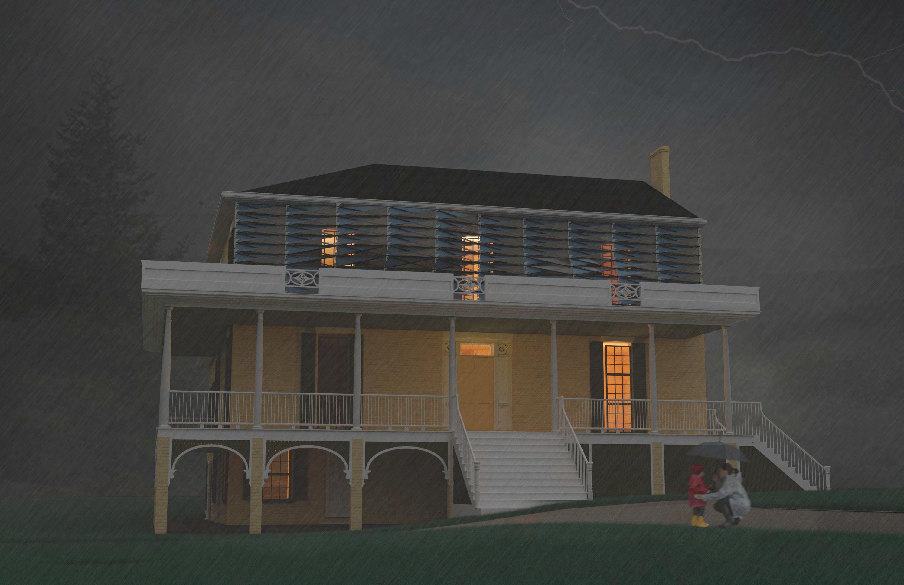 The design investigates an innovative and emergent infrastructure to revitalize the landscape and natural world of Thomas Cole. Located in Catskills, New York, the Thomas Cole National Historic Site is a National historical site that includes the house and the works of painter Thomas Cole. The facade investigates the juxtaposition of the untouched wilderness and human creation. The parallel of the enriched history of the house co-existing with the introduction of a new foreign technology acts as a pretense for what is to come.