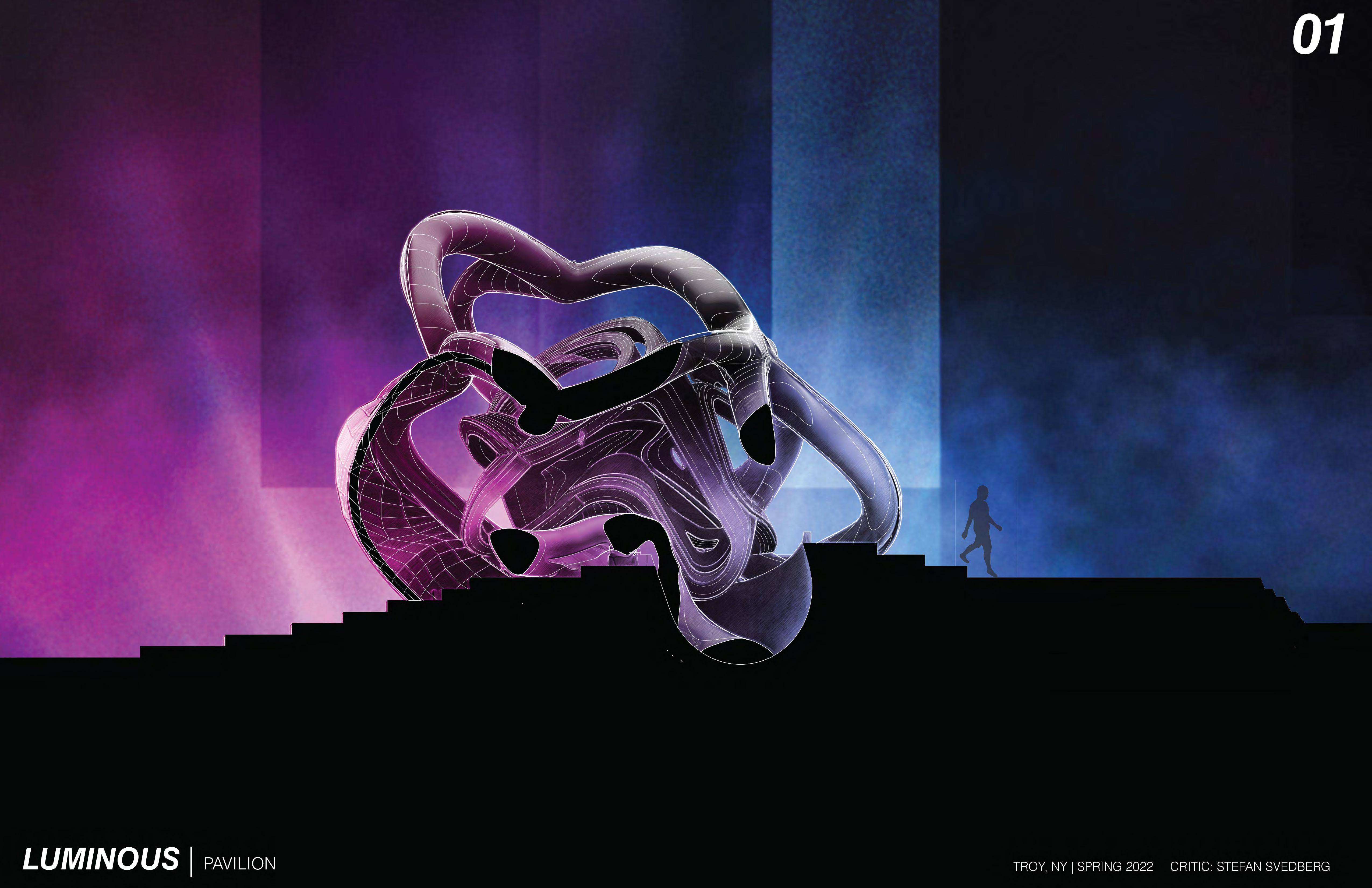 Sitting alongside the raging Hudson River is Luminous. Luminous is a site composed of 4 unique geometric structures that include elements of puffs, inflations, and light. Each form resides in a topography custom to the configuration of the frames and shapes that create these pavilions. Each pavilion simultaneously explores the notion of light literally and symbolically, creating a pavilion that illuminates the Troy Riverfront with beautiful colors. These rays of light will shine through these semitransparent inflations creating a glow-like characteristic to the pavilion. An inhabitable structure will be embedded deep in the ground. This structure will be accessible through the sides of the inflated frames reaching the interior frame leading further underground. In this underground space, individuals will notice the intrusions of puff inflations with light protruding through them. This will create an immersive environment where individuals can experience the full effect of the light pavilion. In addition, this space will hold a learning experience through the symbolism of light in conjunction with its true meaning of life, happiness, and joy. This space will go on to highlight the great moments of Troy in both past and present events.