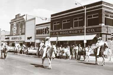 staples in downtown Shawnee, both primarily made up of young people from local high school bands, school classes, Scouts and Camp Fire Girls and other clubs. And from the beginning, hors es were always a big part of parades whether pulling floats, circus acts or the Round-up Club. Most parades featured contests and prizes, and Santa Claus usually made his appearance at Christ mas riding on a fire truck as his “elves” tossed candy to the chil dren.