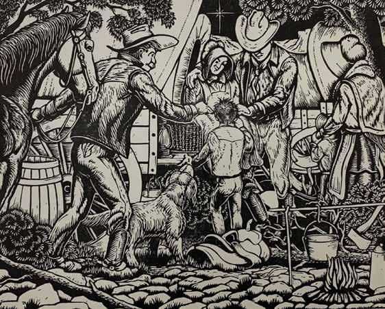 Both pieces are reimaginings of the Nativity scene in new and different settings. In “Teepee Manger,” Swineford reimag ines the Nativity with Native Americans. In “Wagon Train Na tivity,” he reimagines the Nativity featuring people who are on a wagon train moving West. Both use the idea of the Nativity, but instead of the traditional Mary and Joseph in a barn, he uses figures from other cultures and time periods.