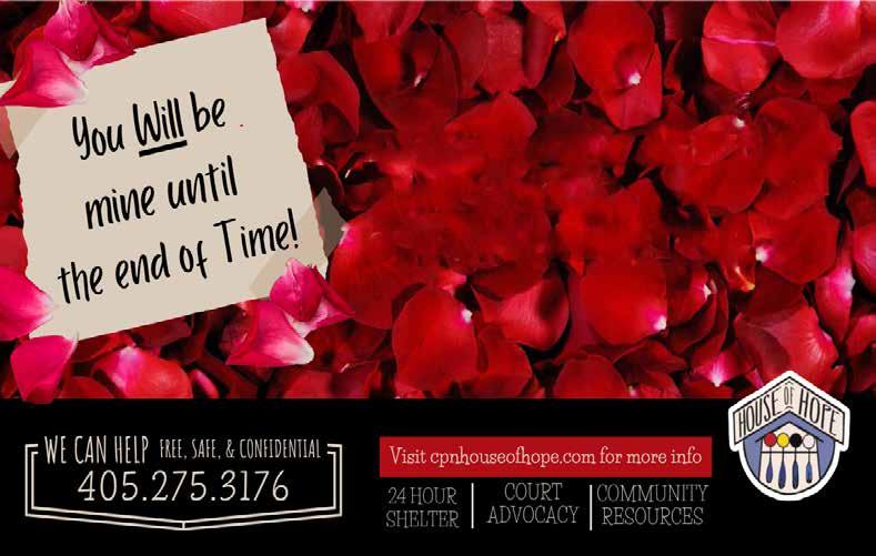 www.shawneeoutlook.com 27 VISIT OUR RETAIL SPACE FOR WINE & BAR WARE. VISIT US Located in Downtown Shawnee Executive Chef Jake Pilley Locally owned, proudly using local ingredients including Crow’s Farms and Shawnee Milling 405-788-4404 • 419 EAST MAIN STREET • SHAWNEE, OKLAHOMA Spend Valentine’s Day at Theopolis. Make your reservations today. LOCAL RESTAURANT AND BAR New Hours! Now Open Tueday-Sunday weekly beginning February 14th. DOMESTIC VIOLENCE AFFECTS NEARLY 40% OF OKLAHOMA RESIDENTS.