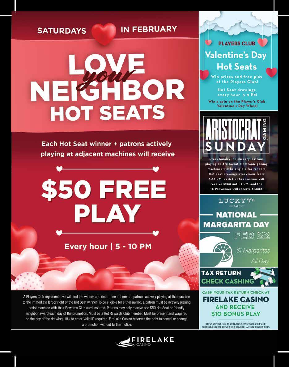 4 www.shawneeoutlook.com Forestry Mulching • Land Clearing Pond Bank Mowing • Cedar Tree Clearing Dirt Work • Dozer Work • Excavator 405-250-5099 Locally Owned, Fully Insured LIBERTY 711 E. FEDERAL | SHAWNEE, OK | 405.273.3022 Sunday, February 26 10:45 a.m. Worship Service MESSAGE BROUGHT BY: Dr. Heath A. Thomas President Oklahoma Baptist University PRAISE AND WORSHIP LED BY: 519 Collective Nursery provided. Meal provided after service. CUPID’S SPECIAL TUESDAY, FEBRUARY 14 | 5PM – 9PM 2 for $32 Includes dinner salad, New York strip steak or marinated chicken breast and sweetheart chocolate cake. Free Play Receive two $7 free play offers with purchase. kickapoo-casino.com See Legacy Sports Bar & Grill for details. One free play offer per person of the couple. LOCATED INSIDE