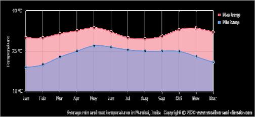 In Mumbai, the wet season is oppressive, windy, and overcast; the dry season is muggy and mostly clear; and it is hot year-round. Over the course of the year, the temperature typically varies from 66°F to 92°F and is rarely below 60°F or above 97°F.