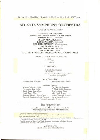 Post Properties, Inc. is proud to sponsor this Master Season weekend of the Atlanta Symphony Orchestra's 1989-1990 season. Patrons are requested to tum off signal watches. The use of cameras or recording devices during concerts is strictly prohibited. +First appearances with the ASO. This performance is being recorded for broadcast at a later time on WABE, FM-90. l. ASO concerts are broadcast Tuesday evenings at 8:00 PM. The ASO records for Telarc, New World, Nonesuch, Pro Arte and MMG/Vox Records. Trucks provided by Ryder Truck Rental, Inc.