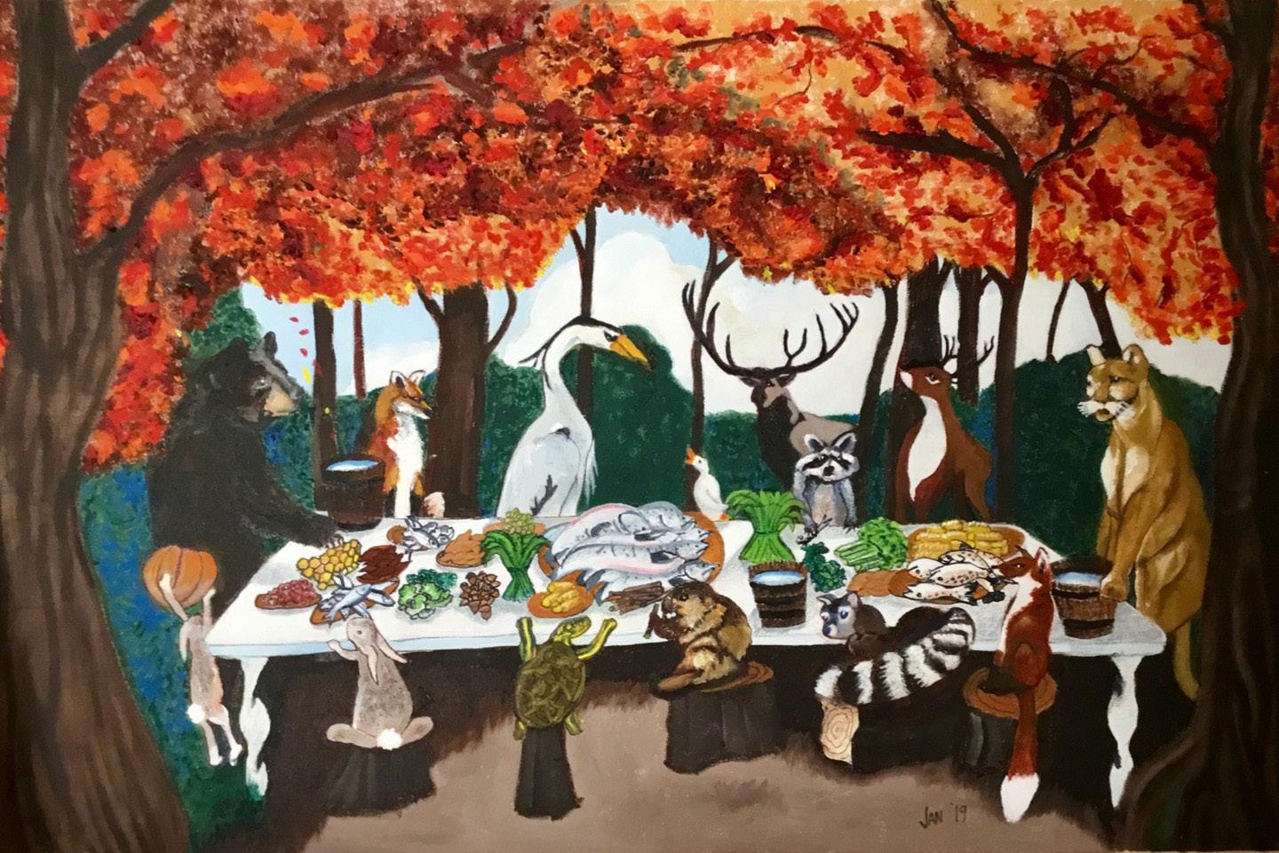 Jan Wall—2019; she gathers only the animals of the Sierra Madre Mountains, California, at a bountiful table. (bottom)