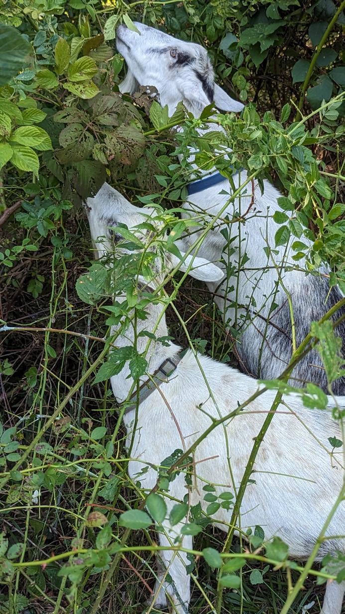 The answer is goatscaping or target grazing. There are environmental, economical, biological reasons for using goats in place of landscaping machinery and herbicides to remove invasive species to support the growth of native plants. Environmentally, goats require water, shade, and predator protection to graze, not fossil fuels.