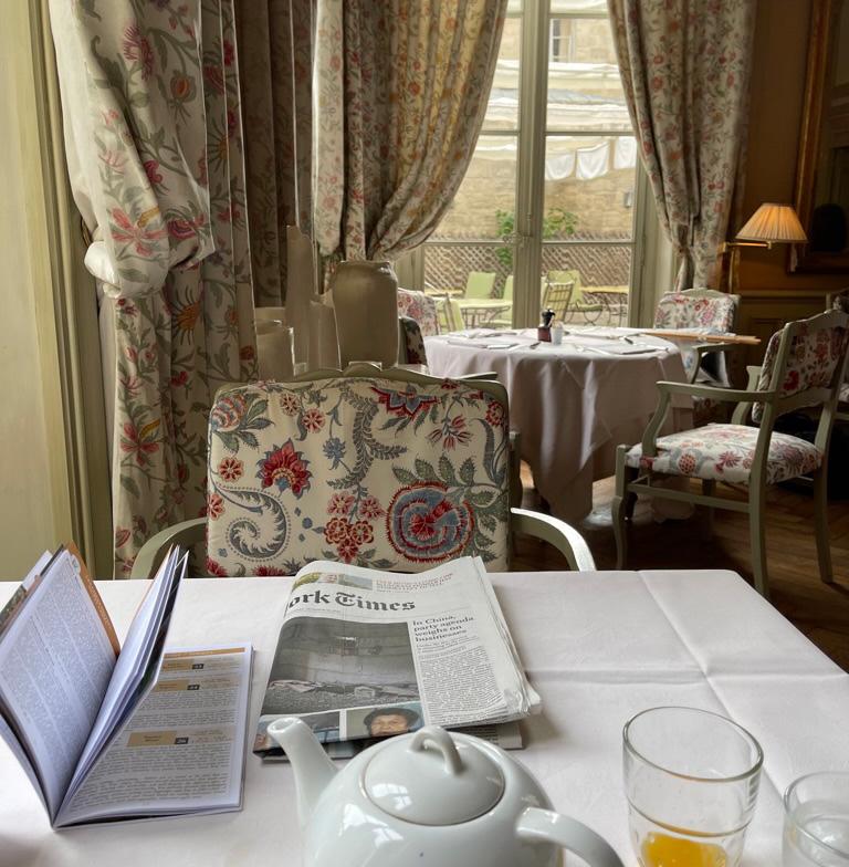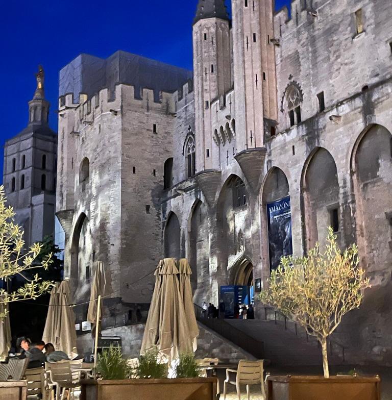 enjoyed sharing a fantastic meal, superb wines, and conversations with new friends. It began with a tour and wine tasting in the original wine cellars and then moved up to the kitchen, where a large wooden table sits in the middle of the room. The chef stands at the head of the table, his back to the old French woodburning stove as he explains what he is making for each course, and the wine expert explains details about each perfectly paired wine as he fills your glass. It is truly a lovely way to experience dinner. Avignon also has many excellent restaurants. You will thoroughly enjoy the Provençal cuisine, which differs significantly from the Parisian cuisine and other regions of France. A breakfast buffet is available each