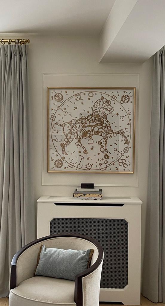 I couldn’t find the right piece of art for my Paris apartment, so I chose to frame one of my Hermès scarves. If you look closely, you can see the equestrian theme, yet it adds a quiet elegance to the room, just as it would to my clothing style.
