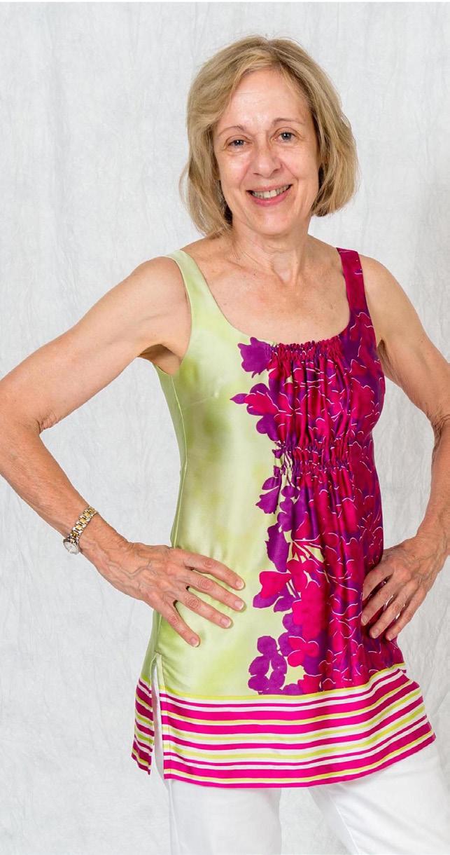 Your eye is drawn to patterns and light, bright colors more so than solid black or navy. Keep this in mind when choosing separates.