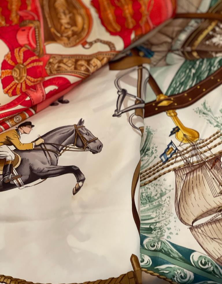 Because of the quality of the silk, hand-rolled edges, and amazing screen printing, Hermès scarves retain their value, and many of the first editions become highly collectible. The silk fabric for the scarves was originally imported from China, which was more