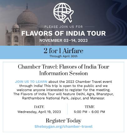 We are finalizing details for our Chamber Travel, November 3rd-14th, 2023 as we explore the Taste of India and celebrate Diwali, The Festival of Lights while we are there. Free airfare is still being offered for this once in a lifetime trip and we have several travelers from Sheboygan County already joining us. To learn more about this opportunity please join us for an information session at the chamber on Wednesday, April 19th from 5p.m.-6p.m. Click here to learn more or contact me directly at deidre@sheboygan.org.