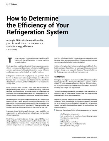 How to Determine the Efficiency of Your Refrigeration System A simple EER calculation will enable you, in real time, to measure a system's energy efficiency – By Ed Estberg