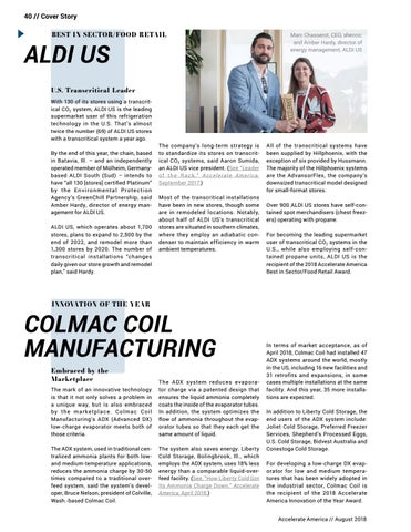 U.S. Transcritical Leader With 130 of its stores using a transcritical CO2 system, ALDI US is the leading supermarket user of this refrigeration technology in the U.S. That’s almost twice the number (69) of ALDI US stores with a transcritical system a year ago. By the end of this year, the chain, based in Batavia, Ill. – and an independently operated member of Mülheim, Germanybased ALDI South (Sud) – intends to have “all 130 [stores] certified Platinum” b y t h e E n v i r o n m e n t a l P r o te c t i o n Agency’s GreenChill Partnership, said Amber Hardy, director of energy management for ALDI US. ALDI US, which operates about 1,700 stores, plans to expand to 2,500 by the end of 2022, and remodel more than 1,300 stores by 2020. The number of transcritical installations “changes daily given our store growth and remodel plan,” said Hardy.
