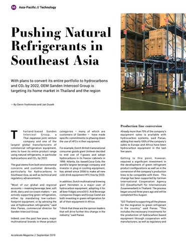 hailand- based Sanden Intercool Group, a Thai-Japanese joint venture company and one of the largest global manufacturers of commercial refrigeration equipment, aims to have its entire product range using natural refrigerants, in particular hydrocarbons and CO 2 , by 2022. The goal stems from both environmental concerns and customer demands, par ticularly for hydrocarbons in Southeast Asia, as well as technical and regulatory advancements. "Most of our global and regional accounts — meaning beverage, beer, soft drink, dairy and ice cream makers — are actively supporting green refrigeration, either by mandating low- carbon footprint equipment, or by advising the use of hydrocarbon refrigerants," said Alex Panas, commercial director for Sanden Intercool Group. Indeed, over the past few years, major multinational brands in these product