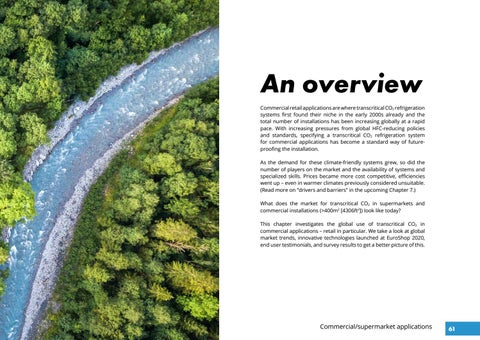 An overview Commercial retail applications are where transcritical CO2 refrigeration systems first found their niche in the early 2000s already and the total number of installations has been increasing globally at a rapid pace. With increasing pressures from global HFC-reducing policies and standards, specifying a transcritical CO2 refrigeration system for commercial applications has become a standard way of futureproofing the installation. As the demand for these climate-friendly systems grew, so did the number of players on the market and the availability of systems and specialized skills. Prices became more cost competitive, efficiencies went up – even in warmer climates previously considered unsuitable. (Read more on “drivers and barriers” in the upcoming Chapter 7.) What does the market for transcritical CO2 in supermarkets and commercial installations (>400m2 [4306ft2]) look like today? This chapter investigates the global use of transcritical CO2 in commercial applications – retail in particular. We take a look at global market trends, innovative technologies launched at EuroShop 2020, end user testimonials, and survey results to get a better picture of this.