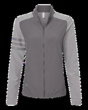 ADIDAS Women's 3-Stripes Jacket is made from 94% recycled polyester, 6% elastane plain weave. Durable water repellent finish, soft shell stretch fabric, half elastic cuffs and two front zip pockets. 3-stripes on right arm. Contrast colour Adidas performance logo on back neck.