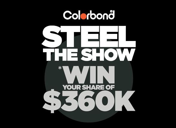 *T&Cs apply, see COLORBOND.COM/STEELTHESHOW. Open to AU res 18+ who purchase genuine COLORBOND® steel product/s ($500 inc GST or more), material only for a residential property they own, from any AU business or businesses in Australia between 30/6/23 & up until 30/11/24. Entries open: 30/6/24. Entries close: 30/11/24. Must retain original contract/s, invoice/s, receipt/s &/or evidence of payment of deposit as proof of purchase. COLORBOND®, BlueScope and the BlueScope brand mark are registered trade marks of BlueScope Steel Limited. © 2024 BlueScope Steel Limited ABN 16 000 011 058. All rights reserved.