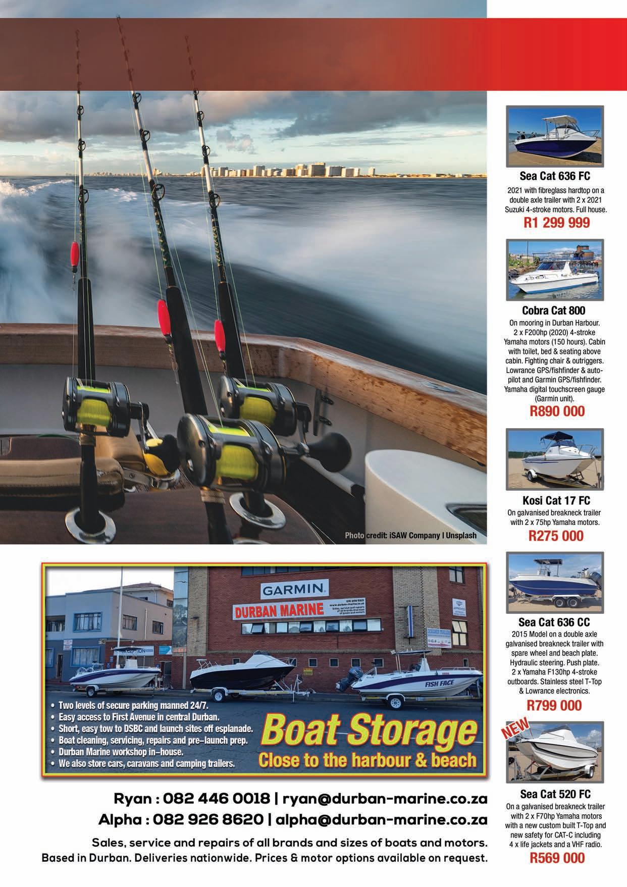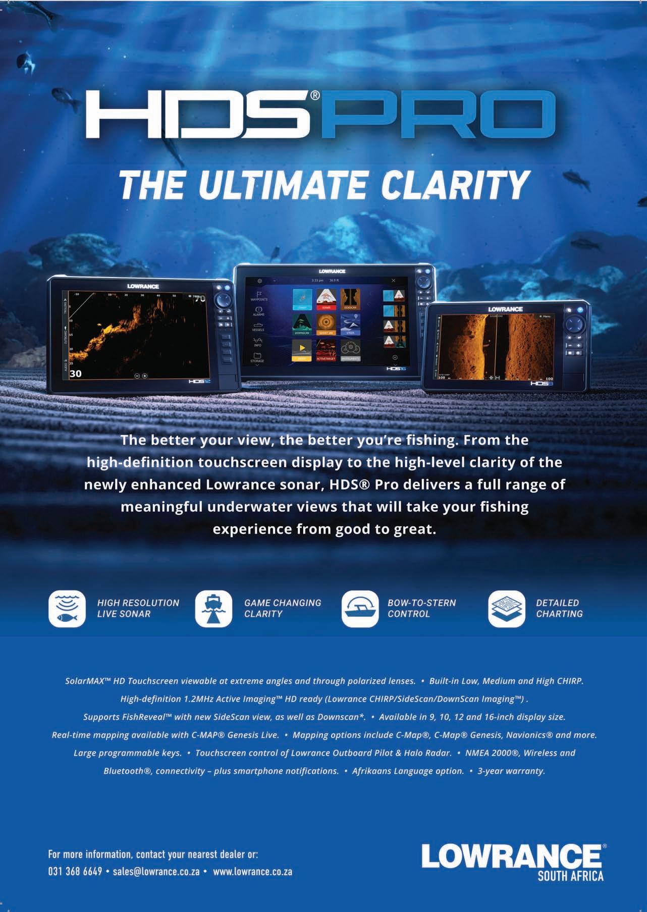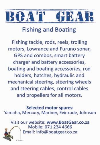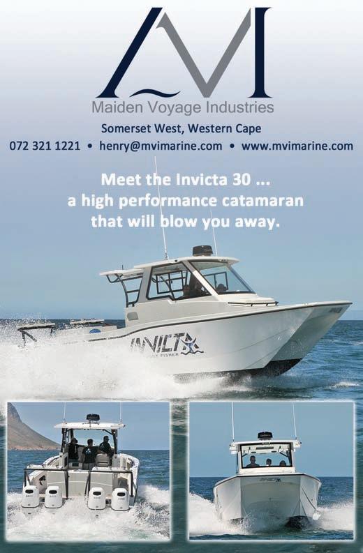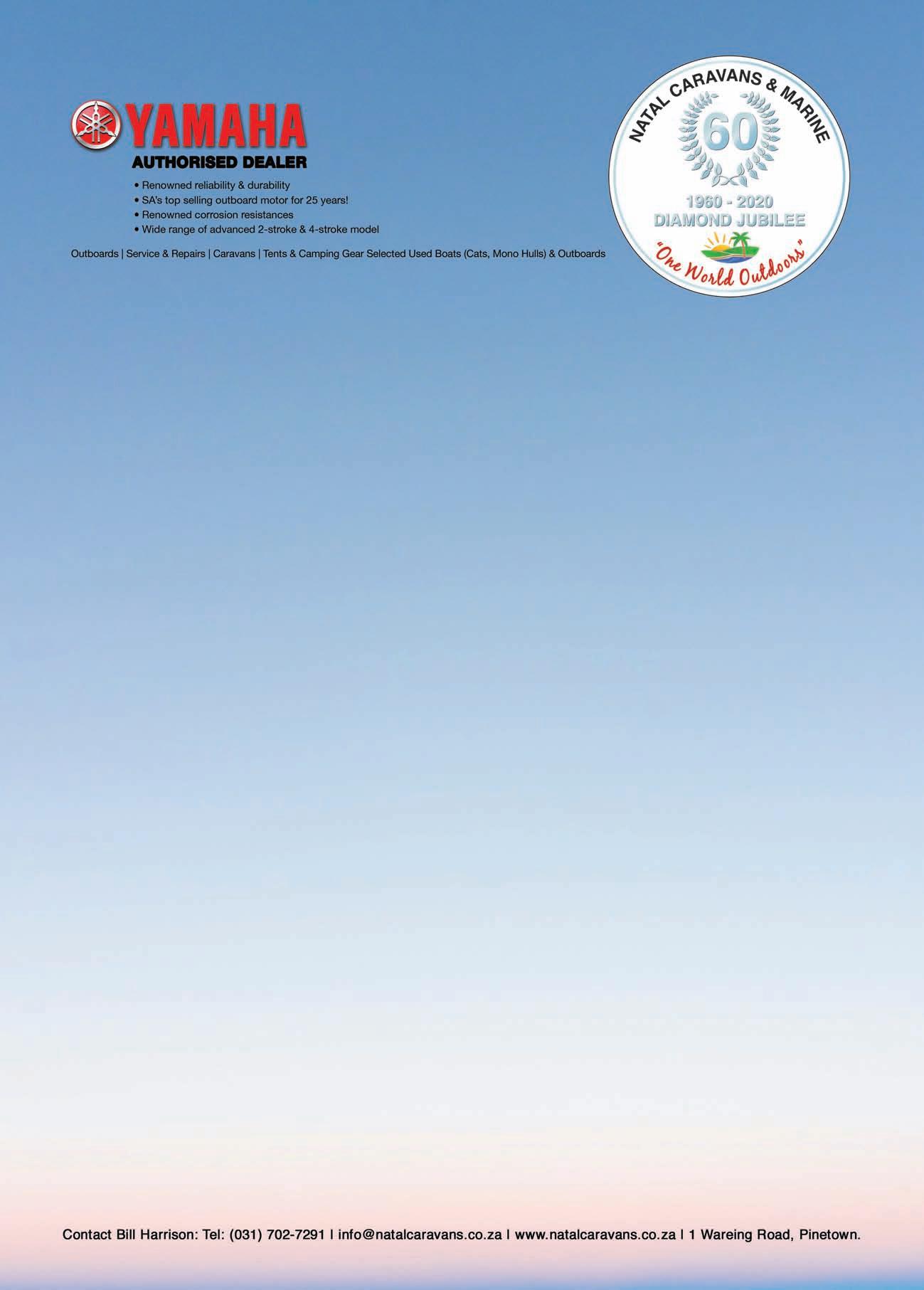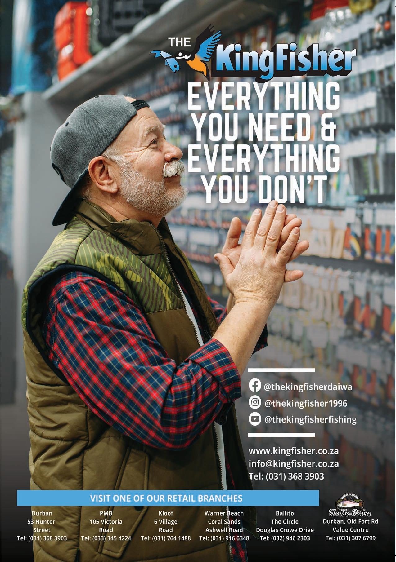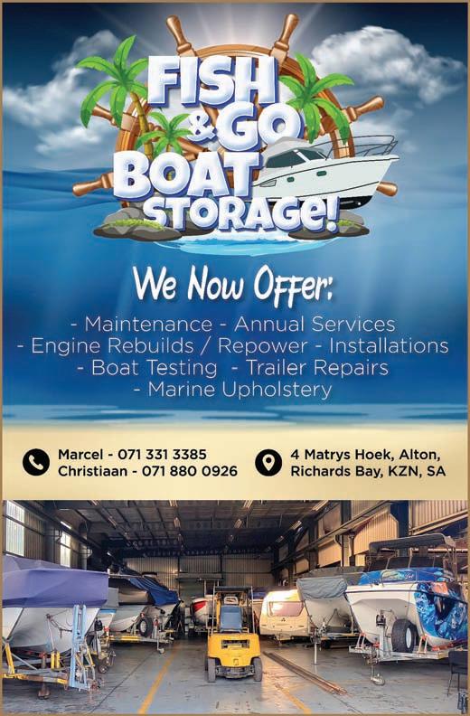 Adventure Tropicale . . . . . . . . . . . . .25 Ballistic Sunglasses . . . . . . . . . . . . . .39 Club Marine Insurance Comp . . . . . . .5 DSBC Festival Sponsors Thanks . . . .33 Durban Marine . . . . . . . . . . . . . . . . . .18 Fish & Go Boat Storage . . . . . . . . . . .44 Garmin . . . . . . . . . . . . . . . . . . . . . . . .20 Greenfish . . . . . . . . . . . . . . . . . . . . . .39 KZN Boat Storage . . . . . . . . . . . . . . . .39 Lands Edge . . . . . . . . . . . . . . . . . . . . .16 Lowrance . . . . . . . . . . . . . . . . . . . . . . .1 Lowrance . . . . . . . . . . . . . . . . . . . . . . .6 Maiden Voyage Industries . . . . . . . . .39 MDM — Raymarine . . . . . . . . . . . . . . .2 Mercury — Rutherford Marine . . . . .34 Mercury — Rutherford Marine . . . . .60 Mr Winch . . . . . . . . . . . . . . . . . . . . . .39 Natal Caravans & Marine . . . . . . . . . .28 Natal Caravans & Marine . . . . . . . . .IBC Natal Caravans & Marine . . . . . . . . .IFC OET . . . . . . . . . . . . . . . . . . . . . . . . . . .17 Queens of the Ocean . . . . . . . . . . . . .53 Riverside Cottages . . . . . . . . . . . . . . .44 Seaport Supply . . . . . . . . . . . . . . . . . . .8 Sodwana Tigerfish Bonanza . . . . . . .48 Solly’s Angler’s Corner . . . . . . . . . . . .6 Stubbsea Charters . . . . . . . . . . . . . . .44 Supercat . . . . . . . . . . . . . . . . . . . . . . .37 The Kingfisher . . . . . . . . . . . . . . . . . .30 Vanguard Insurance . . . . . . . . . . . .OBC ADINDEX DEADLINEFORTHE SEPTEMBER2023 ISSUEOF IS12 JULY 2023. BOOKYOURSPACENOW. CALL: 073 748 6107 <mark@mags.co.za>