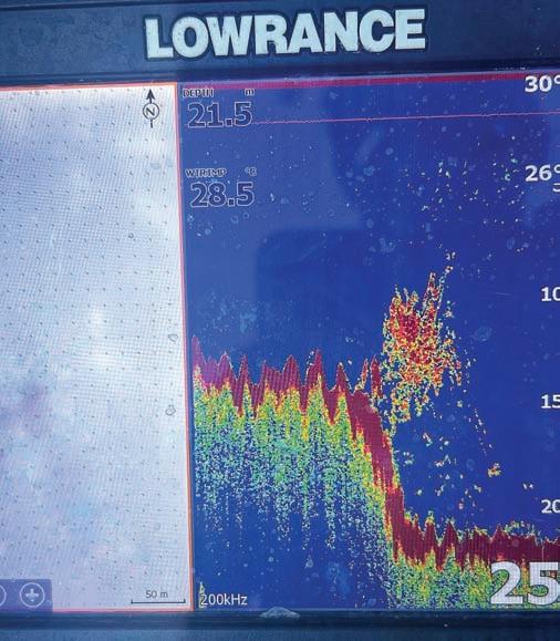 between my fingers and watched it slowly straighten up — again and again. Suddenly the fishfinder lit up with torpedos under the boat — 30m then 20m from us.They were definitely there!