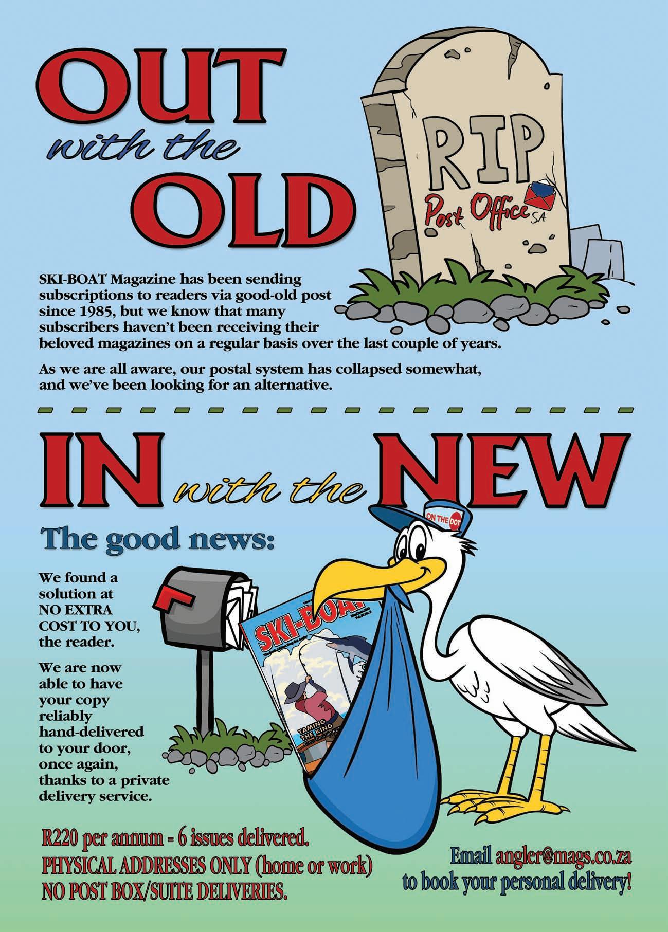 SKI-BOAT Magazine, ISSN 0258-7297, is published six times a year by Angler Publications & Promotions cc, Reg. No. CK 88/05863/23, and is distributed by On the Dot, as well as directly by the publishers to retail stores throughout South Africa.