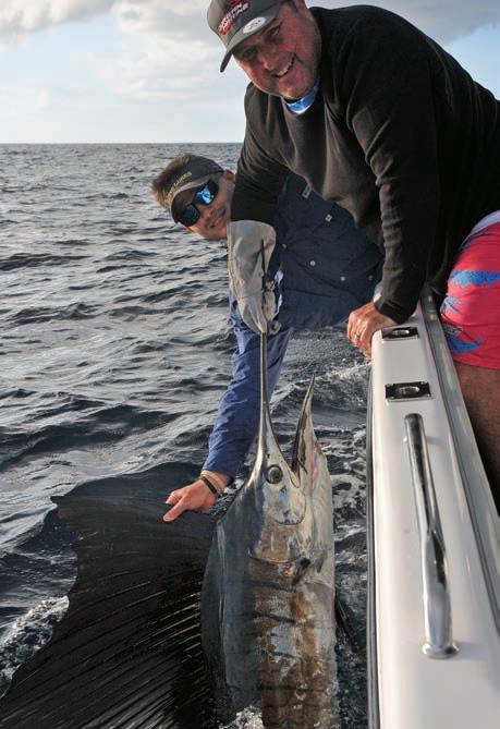 Battling the fish in a stand-up position using a Black Magic harness,Jannas held strong while Michael took the leader,I recorded the action,and Gavin expertly manouevred the boat.After an intense 25-minute fight,the fish was brought boatside.Initially mistaken for a blue marlin,closer inspection revealed it to be a massive sailfish –approximately 80kg – with a torn dor-