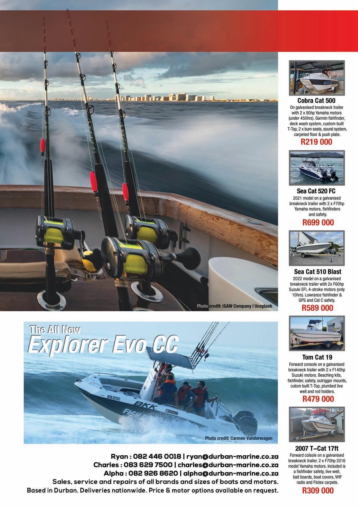 CONSOLE Yamaha 60hp 4-stroke motor, galvanised breakneck trailer. R334 000! CENTRE CONSOLE 2 x Yamaha 70hp 4-stroke motors, hydraulic steering, galvanised breakneck trailer. R619 000! Hustler 156 F/C 2 x Yamaha 40hp (2-stroke/pre-mix) motors (incl. powertrim/beach kits & 1-year motor warranties). Lowrance fishfinder, full set safety gear (Cat E), boat & motor covers, live well with pumps, etc. Navigation light with switch panel, flush fish hatch, sun canopy and rod holders. Roadworthy galvanised breakneck trailer (15’ wheels + spare – great for beach launch)! ONLY: R98 000 Unique 520 RTB Cat 2 x Yamaha 40hp motors (3-cylinder/ autolube/non-trim). Garmin Striker 5 fishfinder, VHF radio, Sony sound system, full set safety gear, boat cover, galvanised breakneck trailer with spare wheel. Roadworthy, COF & buoyancy included. ONLY: R89 995 Pre-owned Seacat 520 FC One careful owner! Hydraulic steering, T-Top, Lowrance Hook 5 GPS/fishfinder, VHF radio, full set safety gear, bum boxes, live well with pump/plumbing, rod holders, 2 x Yamaha F70hp motors (only 54 hours)! Balance of new motor warranty till June 2023. Beach kits, in-line watertrap filters, gavanised breakneck trailer, roadworthy and spare wheel. ONLY: R569 000 Pre-ownedPre-owned Pre-owned Seacat Explorer Kosi Cat 17 Evo 19 565 510 (Gen 3) 520 465 510 Blast pre-owned never looked so good! finance available nationwide delivery 2020 2020