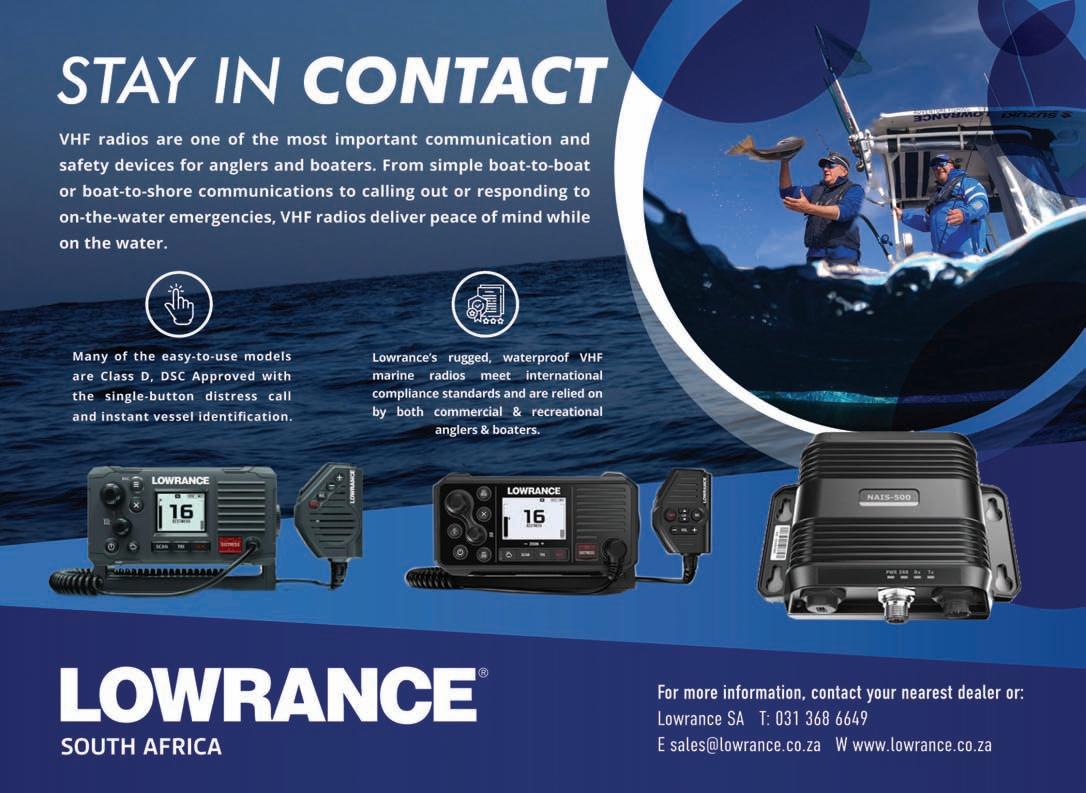 Adventure Tropicale . . . . . . . . . . . . .41 Billfish 15000 . . . . . . . . . . . . . . . . . . . .8 Boatica Cape Town Boat Show . . . . .52 Club Marine Insurance . . . . . . . . . . . .5 Durban Marine . . . . . . . . . . . . . . . . . .30 Garmin . . . . . . . . . . . . . . . . . . . . . . .32 Greenfish . . . . . . . . . . . . . . . . . . . . . .40 Guinjata Thank you Sponsors . . . . .29 Happy Wanderers . . . . . . . . . . . . . . .13 HIP Jerry cans . . . . . . . . . . . . . . . . . .24 Jacita Tackle . . . . . . . . . . . . . . . . . . . .54 KZN Boat Storage . . . . . . . . . . . . . . . .13 Lowrance . . . . . . . . . . . . . . . . . . . . . . .1 Lowrance . . . . . . . . . . . . . . . . . . . . . .26 Maiden Voyage Industries . . . . . . . . .40 Makaira Holdings . . . . . . . . . . . . . . . .51 MDM — Raymarine . . . . . . . . . . . . . . .2 Mercury — Rutherford Marine . . . . .60 Mercury — Rutherford Marine . . . . . .7 Mr Winch . . . . . . . . . . . . . . . . . . . . . .36 Natal Caravans & Marine . . . . . . . . .IBC Natal Caravans & Marine . . . . . . . . .IFC Nhoxani Guesthouse . . . . . . . . . . . . .26 Seaport Supply . . . . . . . . . . . . . . . . . .37 SMG Yamaha . . . . . . . . . . . . . . . . . . .21 Solly’s Angler’s Corner . . . . . . . . . . .24 Stubbsea Charters . . . . . . . . . . . . . . .13 Supercat . . . . . . . . . . . . . . . . . . . . . . .35 Taylor Marine SA - Furuno . . . . . . . .15 The Kingfisher . . . . . . . . . . . . . . . . . .42 Vanguard Insurance . . . . . . . . . . . .OBC Villa Martins, Inhaca . . . . . . . . . . . . .45 Yamaha . . . . . . . . . . . . . . . . . . . . . . . .18 ADINDEX DEADLINEFORTHE NOVEMBER2023 ISSUEOF IS13 SEPTEMBER 2023. BOOKYOURSPACENOW. CALL: 073 748 6107 <mark@mags.co.za>