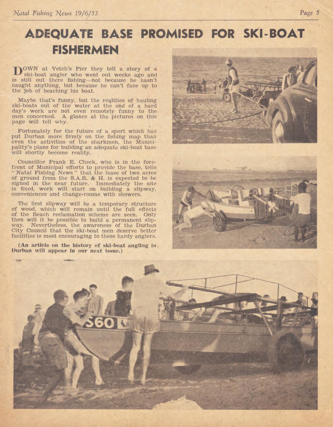 The article opposite highlights talk of the Durban Municipality building a ski-boat base and slipway near Vetch’s Pier,and although the base was established,the slipway was unlikely to ever materialise due to the area’s landscape and conditions,but it’s still a popular launch site.