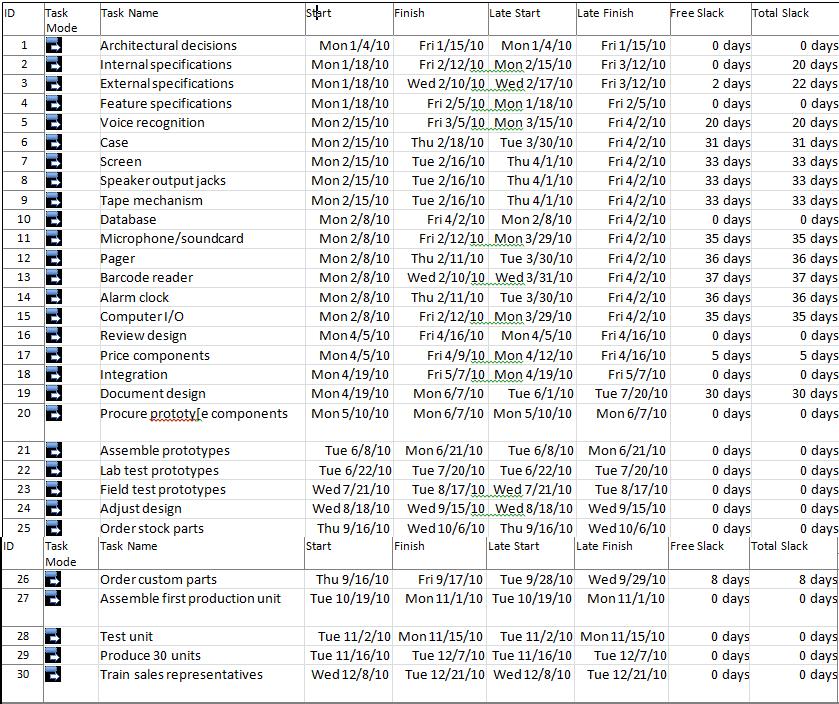 Task Mode Task Name Duration Start Finish Predecessors Auto Scheduled Architectural decisions 10 days Mon 1/4/10 Fri 1/15/10 Auto Scheduled Internal specifications 20 days Mon 1/18/10 Fri 2/12/10 1 Auto Scheduled External specifications 18 days Mon 1/18/10 Wed 2/10/10 1 Auto Scheduled Feature specifications 15 days Mon 1/18/10 Fri 2/5/10 1 Auto Scheduled Voice recognition 15 days Mon 2/15/10 Fri 3/5/10 2,3 Auto Scheduled Case 4 days Mon 2/15/10 Thu 2/18/10 2,3 Auto Scheduled Screen 2 days Mon 2/15/10 Tue 2/16/10 2,3 Auto Scheduled Speaker output jacks 2 days Mon 2/15/10 Tue 2/16/10 2,3 Auto Scheduled Tape mechanism 2 days Mon 2/15/10 Tue 2/16/10 2,3 Auto Scheduled Database 35 days Mon 2/8/10 Fri 3/26/10 4 Auto Scheduled Microphone/soundcard 5 days Mon 2/8/10 Fri 2/12/10 4 Auto Scheduled Pager 4 days Mon 2/8/10 Thu 2/11/10 4 Auto Scheduled Barcode reader 3 days Mon 2/8/10 Wed 2/10/10 4 Auto Scheduled Alarm clock 4 days Mon 2/8/10 Thu 2/11/10 4 Auto Scheduled Computer I/O 5 days Mon 2/8/10 Fri 2/12/10 4 Auto Scheduled Review design 10 days Mon 3/29/10 Fri 4/9/10 5,6,7,8,9,10,11,12,13,14,15 Auto Scheduled Price components 5 days Mon 3/29/10 Fri 4/2/10 5,6,7,8,9,10,11,12,13,14,15 Auto Scheduled Integration 15 days Mon 4/12/10 Fri 4/30/10 16,17 Auto Scheduled Document design 35 days Mon 4/5/10 Fri 5/21/10 16SS+5 days Auto Scheduled Procure prototype components 15 days Mon 5/3/10 Fri 5/21/10 18 Auto Scheduled Assemble prototypes 10 days Mon 5/24/10 Mon 6/7/10 20 Auto Scheduled Lab test prototypes 20 days Tue 6/8/10 Tue 7/6/10 21 Auto Scheduled Field test prototypes 20 days Wed 7/7/10 Tue 8/3/10 19,22 Auto Scheduled Adjust design 20 days Wed 7/28/10 Tue 8/24/10 23SS+15 days Auto Scheduled Order stock parts 10 days Wed 8/4/10 Tue 8/17/10 24SS+5 days Auto Scheduled Order custom parts 2 days Wed 8/4/10 Thu 8/5/10 24SS+5 days Auto Scheduled Assemble first production unit 10 days Mon 8/30/10 Mon 9/13/10 25FS+8 days,26FS+13 days Auto Scheduled Test unit 10 days Tue 9/14/10 Mon 9/27/10 27 Auto Scheduled Produce 30 units 15 days Tue 9/28/10 Mon 10/18/10 28 Auto Scheduled Train sales representatives 10 days Tue 10/12/10 Mon 10/25/10 29FS-‐5 days,28SS+5 days