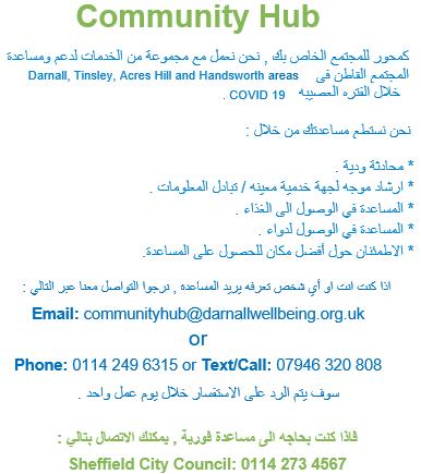 As your local Community Hub, Darnall Well Being are working closely with a range of services in the Darnall, Tinsley, Acres Hill and Handsworth areas to support the community during Covid-19. We can help you by offering: