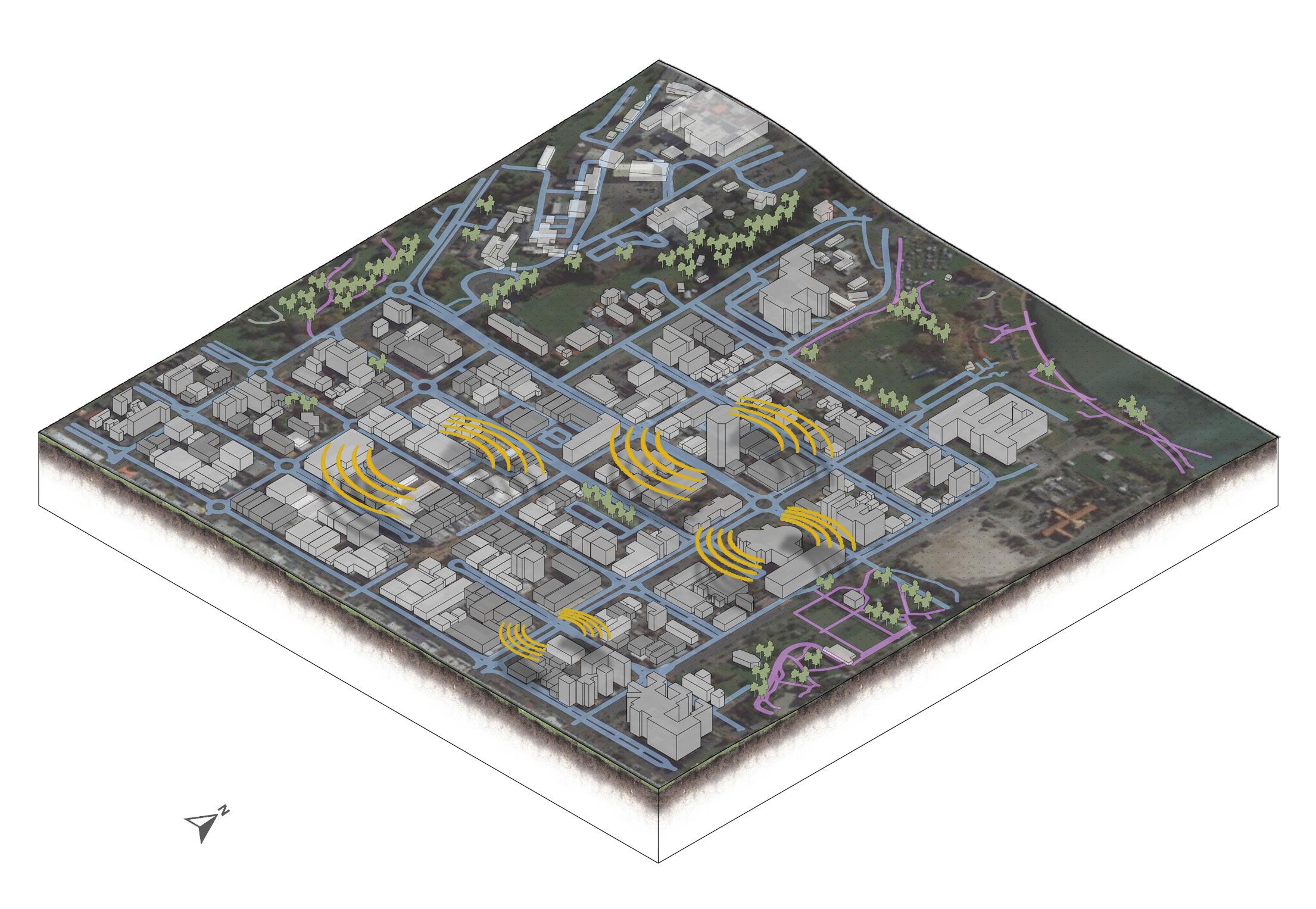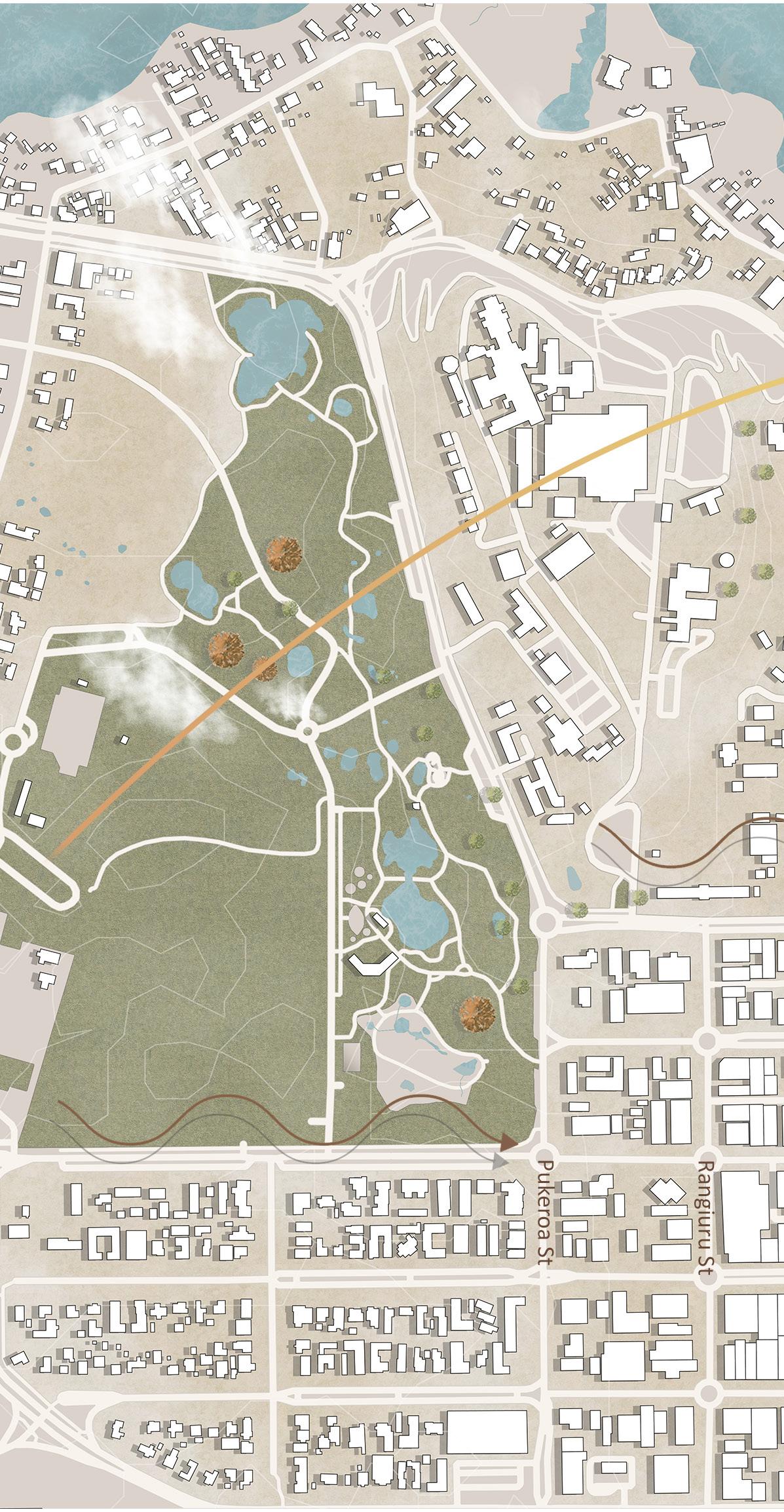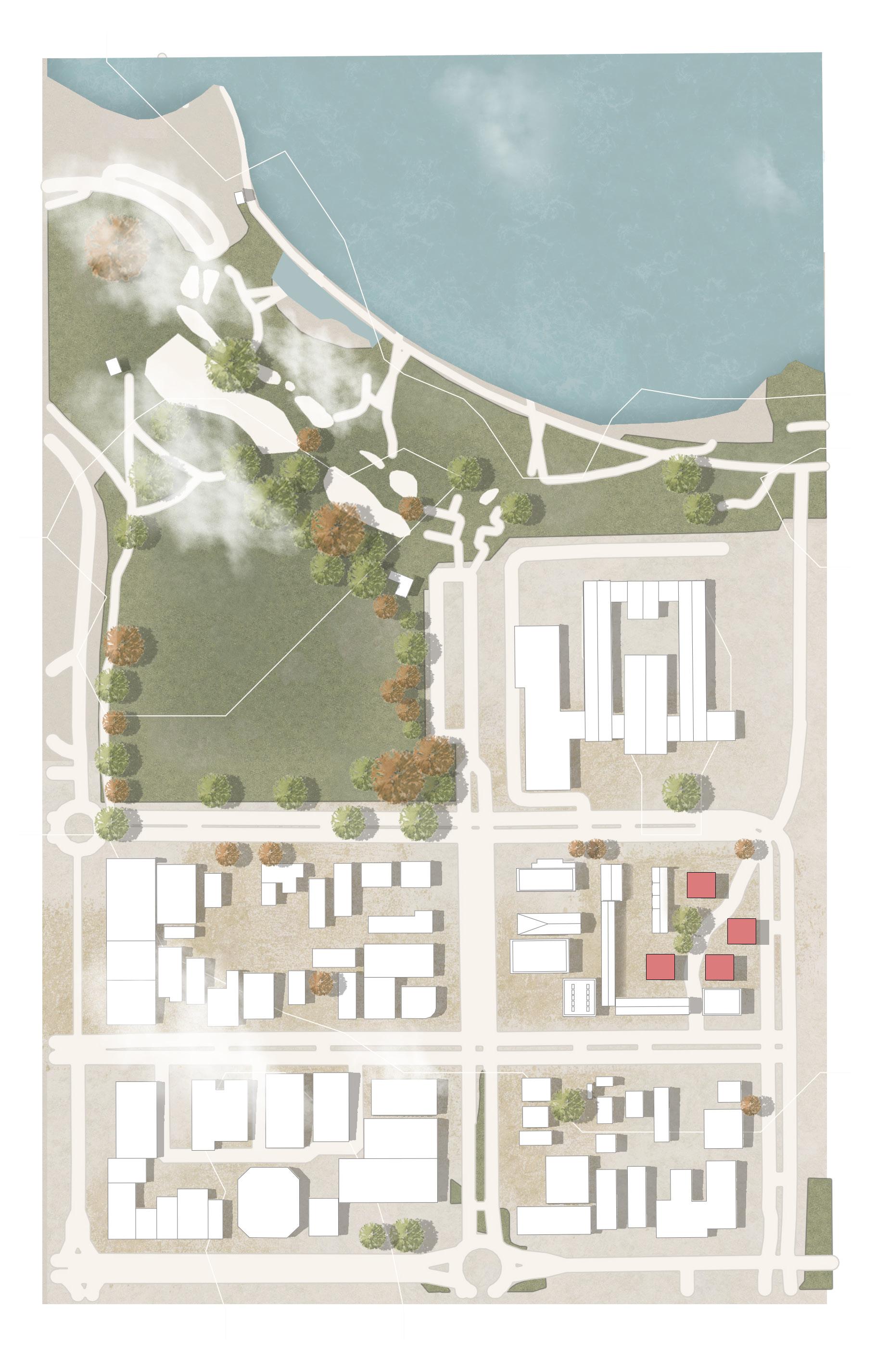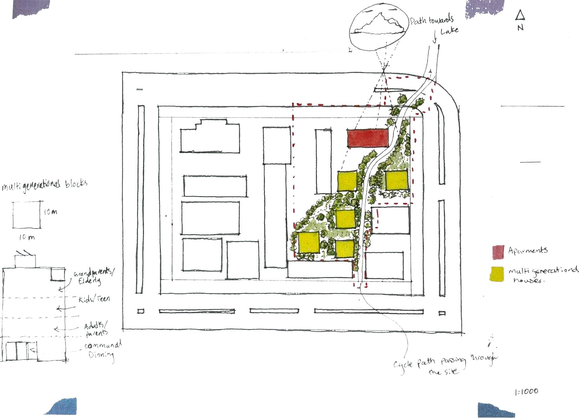 The plan is to establish an intergenerational hub within the area. Featuring smaller-scale homes scattered throughout the site and larger-scale apartments with public amenities. The proposal also includes a public walkway that provides for a flowing path that bridges the intergenerational hun to the lake's near ends. This increases the area's activity and connects locals from the public and private sectors.